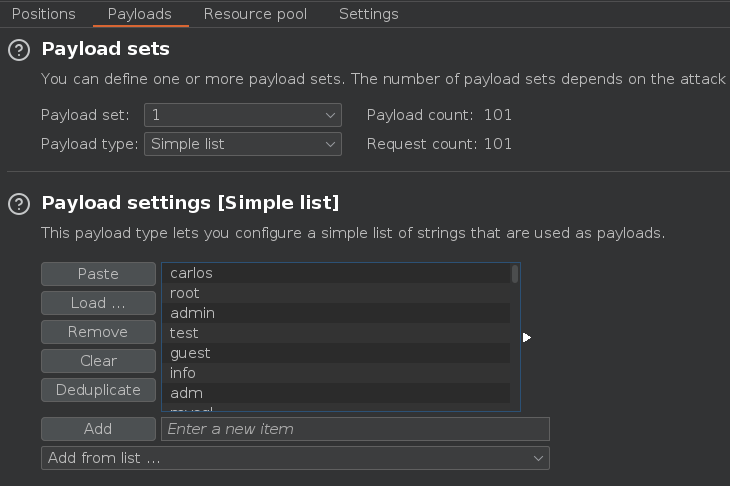 Posteriormente nos copiamos todos los nombres de usuario del diccionario Candidate usernames https://portswigger.net/web-security/authentication/auth-lab-usernames y los pegamos en el apartado de Payloads