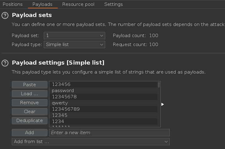 En la parte de Payloads vamos a usar el diccionario Candidate payloads https://portswigger.net/web-security/authentication/auth-lab-passwords