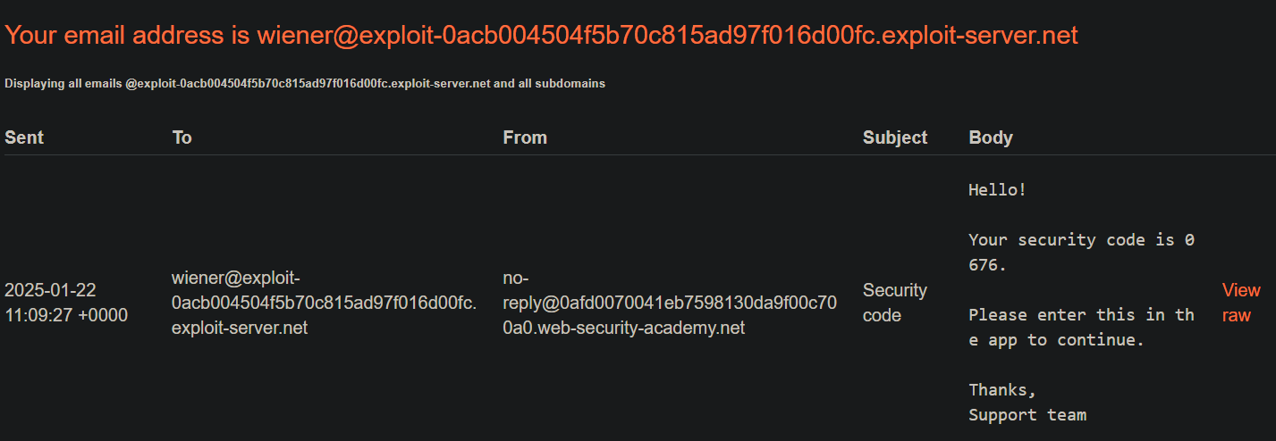 Introducimos el código de verificación y nos redirige a https://0afd0070041eb7598130da9f00c700a0.web-security-academy.net/my-account?id=wiener