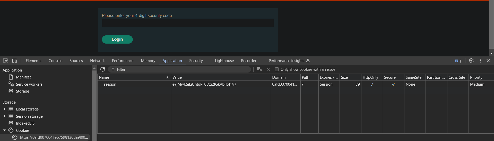 Si pulsamos Ctrl + F5 para recargar la página borrando el caché tampoco cambia el valor de la cookie. Sin embargo si iniciamos sesión con nuestras credenciales wiener:peter vemos que nos pide el segundo factor de autenticación pero que también nos setea una nueva cookie