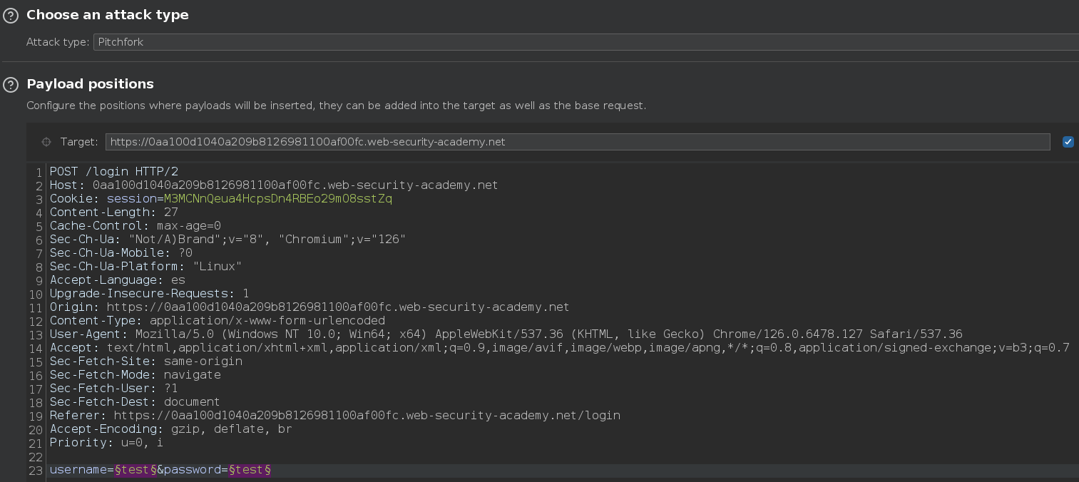 Ahora debemos hacer una petición al login, capturarla con Burpsuite, mandarla al Intruder, seleccionar el campo username y password y seleccionar la opción de ataque Pitchfork