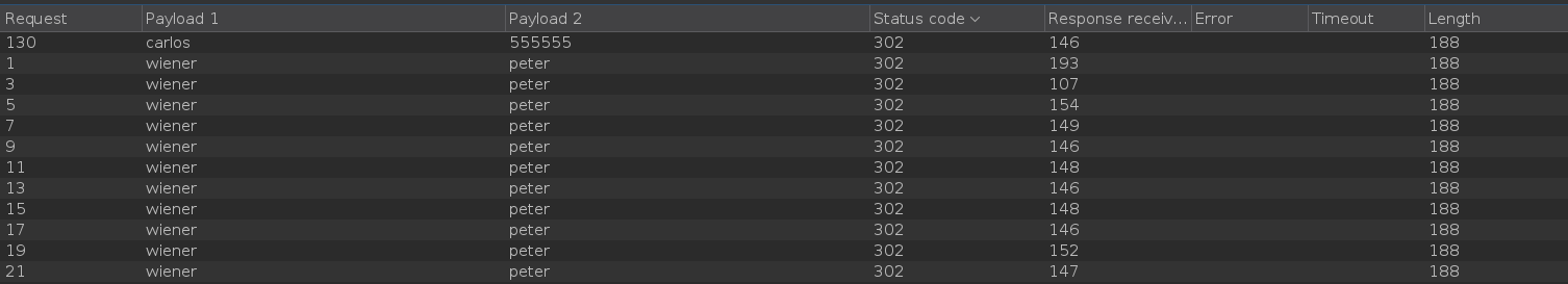 Si filtramos vemos como si iniciamos sesión con las credenciales correctas wiener:peter nos devuelve un código de estado 302, por lo tanto si al usar las credenciales carlos:555555 nos devuelve un 302 también significa que las credenciales son válidas