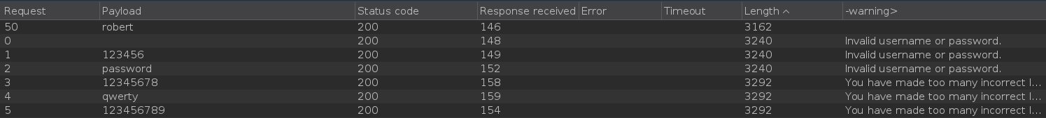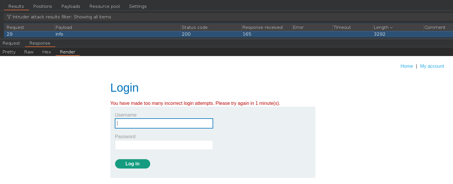 El ataque de fuerza bruta funciona porque al loguearnos nosotros con un usuario existente y una contraseña inválida nos devuelve este mensaje Invalid username or password. o este otro You have made too many incorrect login attempts. Please try again in 1 minute(s)., sin embargo, aunque nosotros hayamos agotado el número de intentos para iniciar sesión si introducimos la contraseña adecuada, la web no nos devolverá ningún mensaje pero no nos dejará iniciar sesión hasta que pase el minuto. De esta forma podemos saber si nuestra contraseña es la correcta. Una vez ha pasado el minuto ya nos podemos loguear con las credenciales info:robert