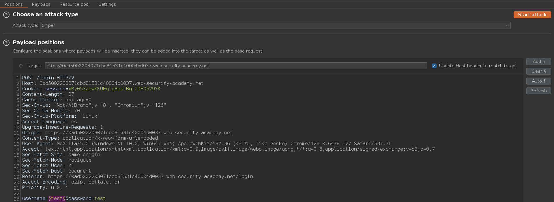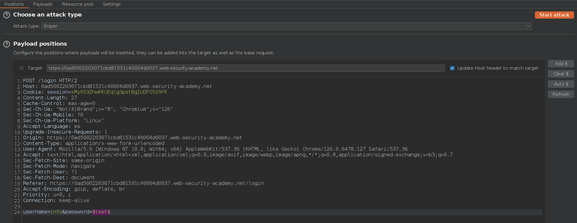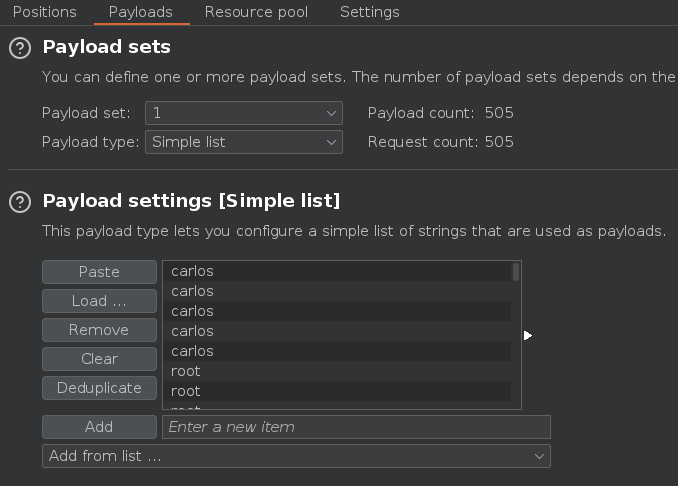 En la parte de Payloads pegamos las contraseñas del diccionario Candidate passwords https://portswigger.net/web-security/authentication/auth-lab-passwords