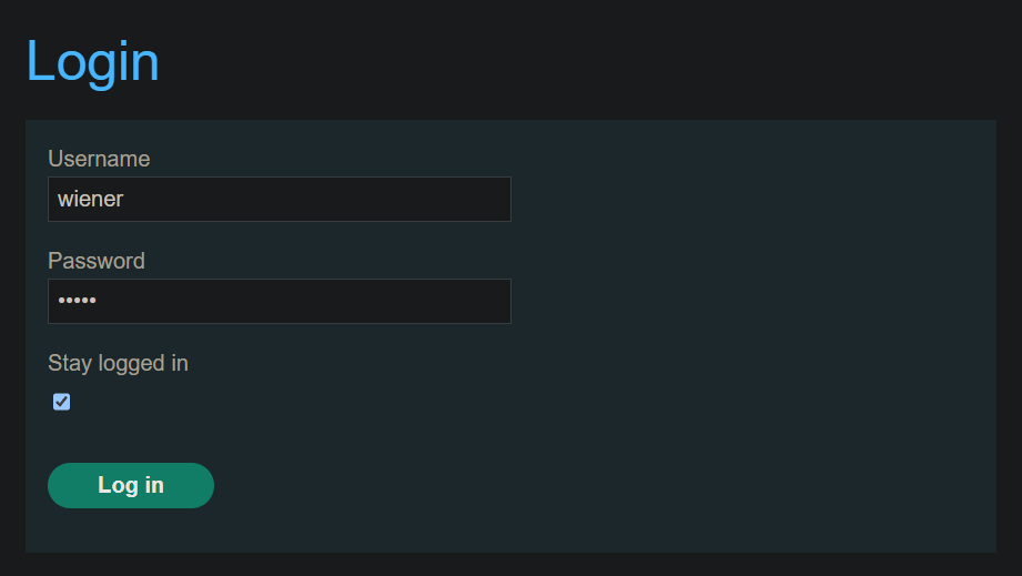Pulsamos sobre My account, nos logueamos usando las credenciales wiener:peter y marcamos la casilla de Stay logged in