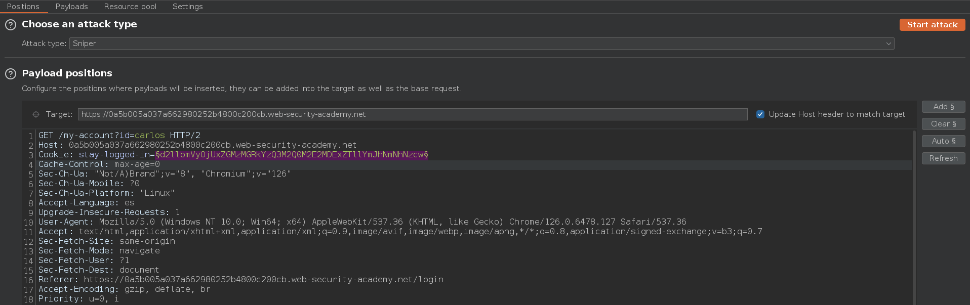 Mandamos la petición al Intruder y ahí marcamos el campo de la cookie a bruteforcear