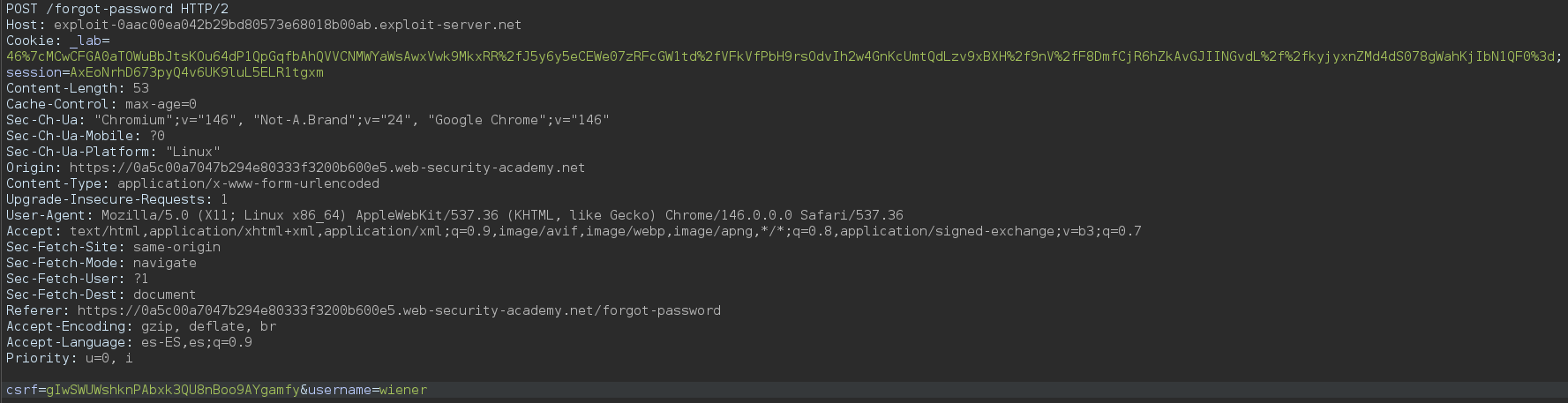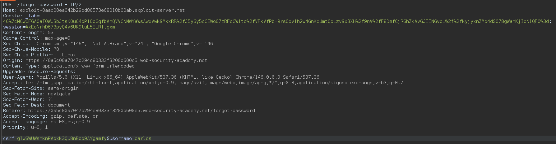 Una vez hemos comprobado esto, cambiamos el valor de la cabecera Host por el dominio de nuestro Exploit server y el username por carlos