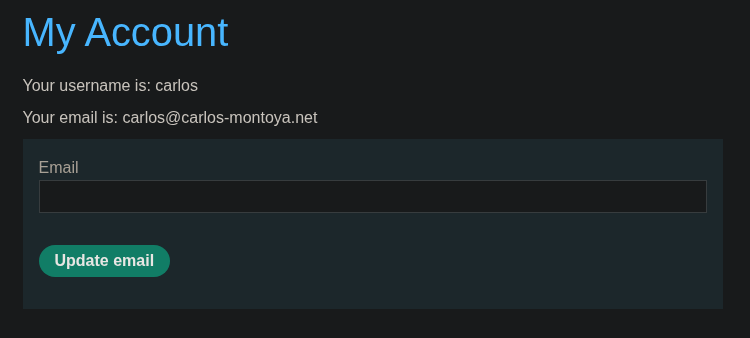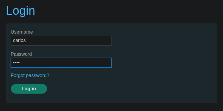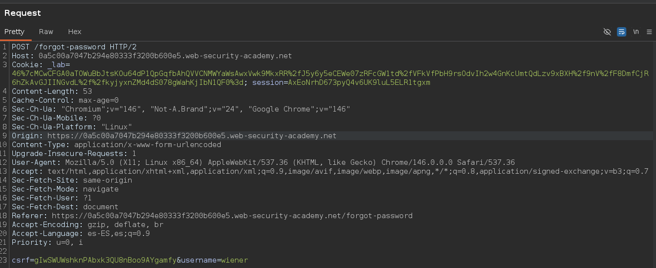 Este laboratorio es vulnerable a password reset poisoning. El usuario Carlos hará click de forma descuidada en cualquier enlace que reciba por correo electrónico. Para resolver el laboratorio, debemos iniciar sesión en la cuenta de Carlos