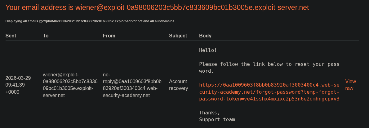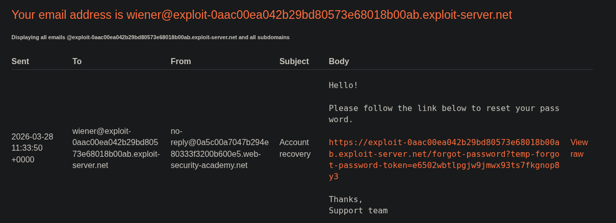 Si nos dirigimos a Exploit server > Email client, vemos como el Host ha cambiado y ahora apunta al dominio de nuestro Exploit Server