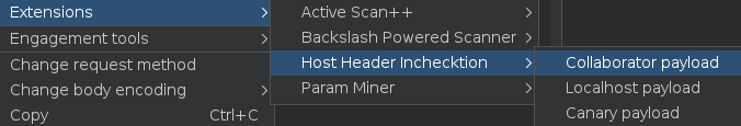 He capturado la petición a la raíz de la web y he lanzado la herramienta Host Header Inchecktion https://github.com/PortSwigger/host-header-inchecktion.git para ver si existía alguna vulnerabilidad relacionada con la cabecera Host. Para lanzar la herramienta debemos hacer click derecho > Extensiones > Host Header inchecktion > Collaborator payload