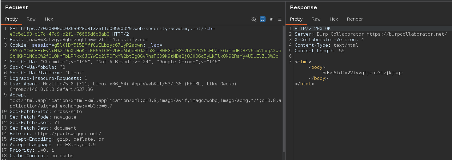 Si enviamos la petición al Repeater vemos que se usa una URL absoluta y que como valor de la cabecera Host se usa un dominio que pertenece a Burpsuite Collaborator