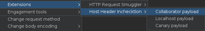 Una vez hemos conseguido bypassear esto, usamos la extensión Host Header Inchecktion https://github.com/portswigger/host-header-inchecktion para enumerar vulnerabilidades de la cabecera Host. Para hacerlo debemos pulsar click derecho > Host Header Inchecktion > Collaborator payload