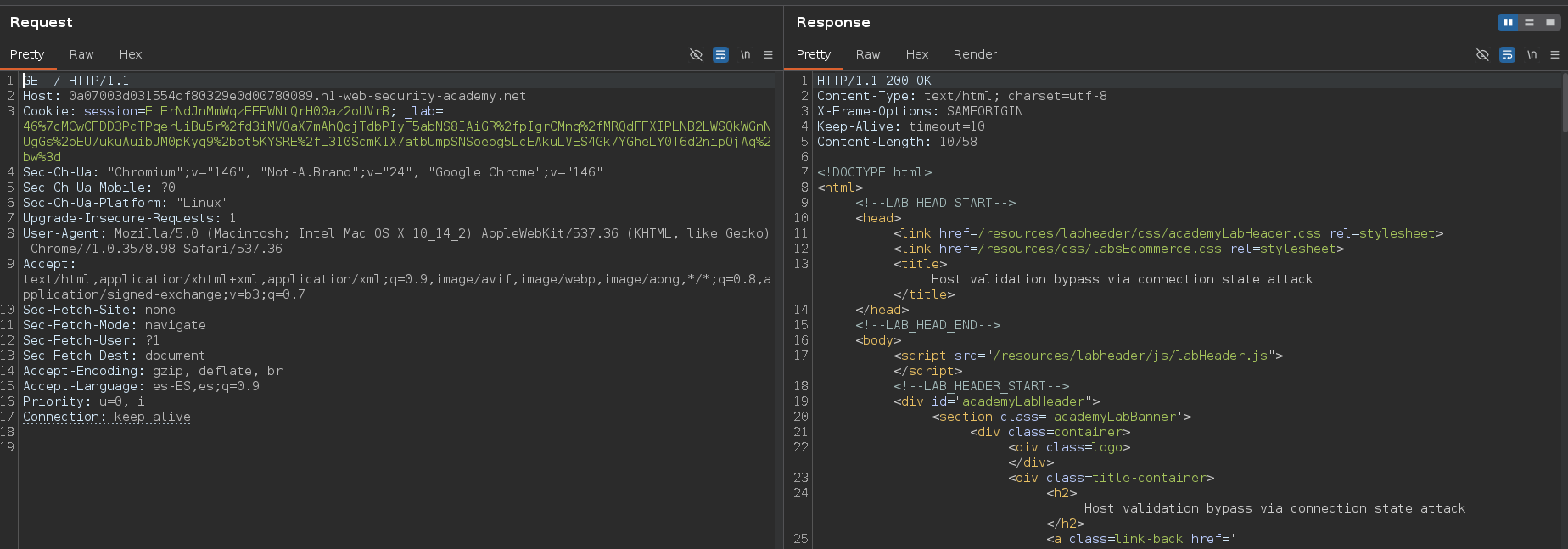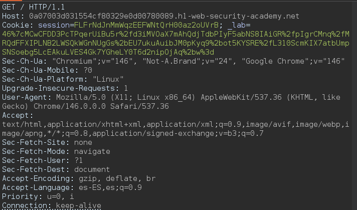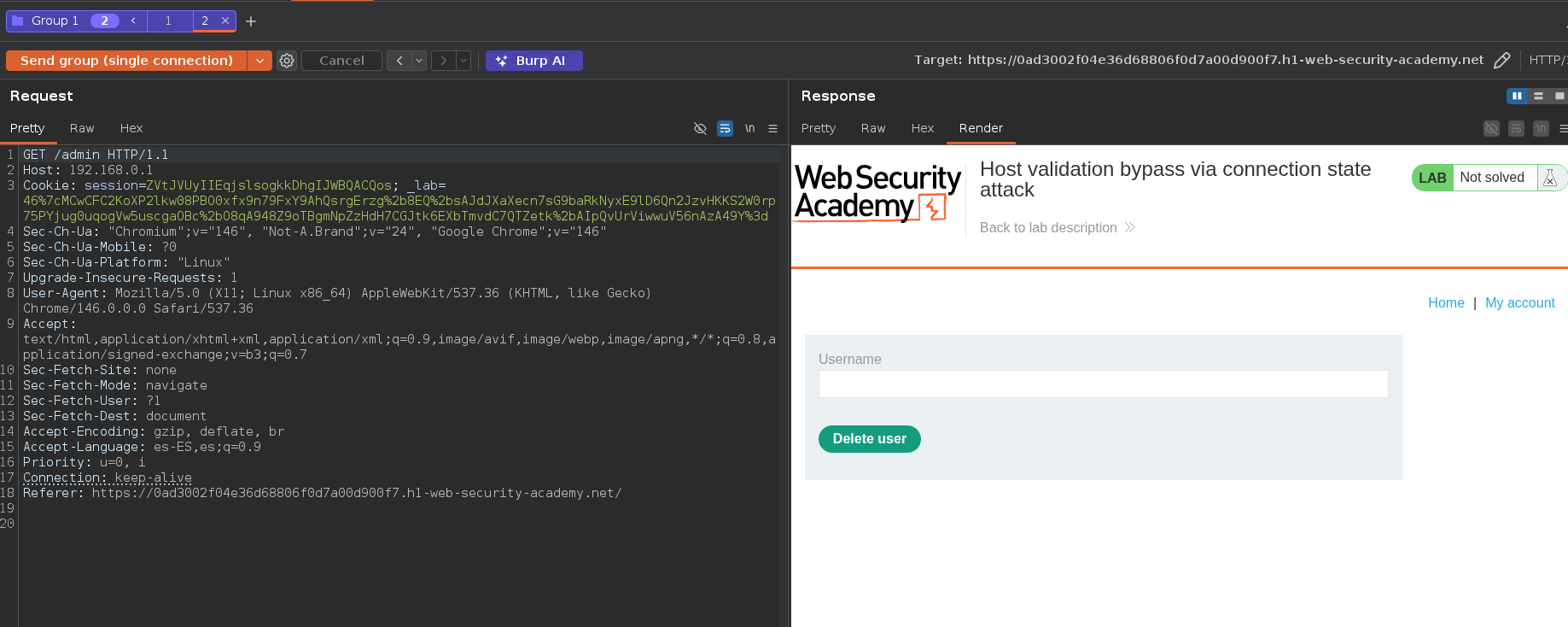 Este laboratorio es vulnerable a Routing-based SSRF a través de la cabecera Host. Aunque el servidor front-end puede parecer que valida correctamente esta cabecera al principio, en realidad asume que todas las solicitudes dentro de la misma conexión son iguales a la primera que recibe. Podemos aprovechar este fallo para acceder a un panel de administración interno inseguro ubicado en una dirección IP interna. Para resolver el laboratorio, tenemos que acceder al panel de administración interno ubicado en el rango 192.168.0.0/24 y luego eliminar al usuario carlos