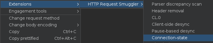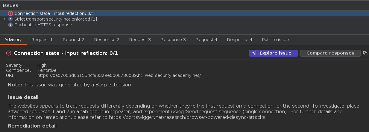 He capturado la petición a la raíz de la web y he lanzado la herramienta HTTP Request Smuggler https://github.com/PortSwigger/http-request-smuggler.git porque he visto que la web usa HTTP 1.1. He ido lanzando ataque por ataque y cuando he lanzado Connection-state me ha reportado algo interesante, esto lo podemos ver accediendo a Target > Site map > Issues