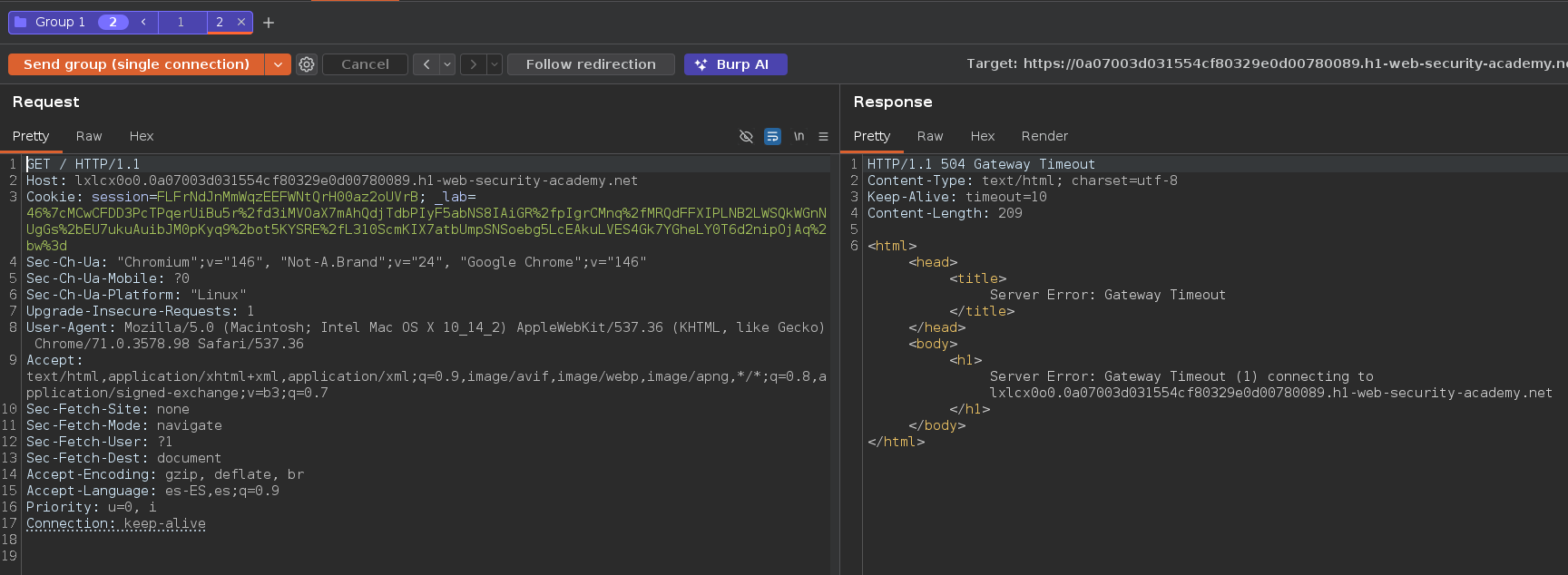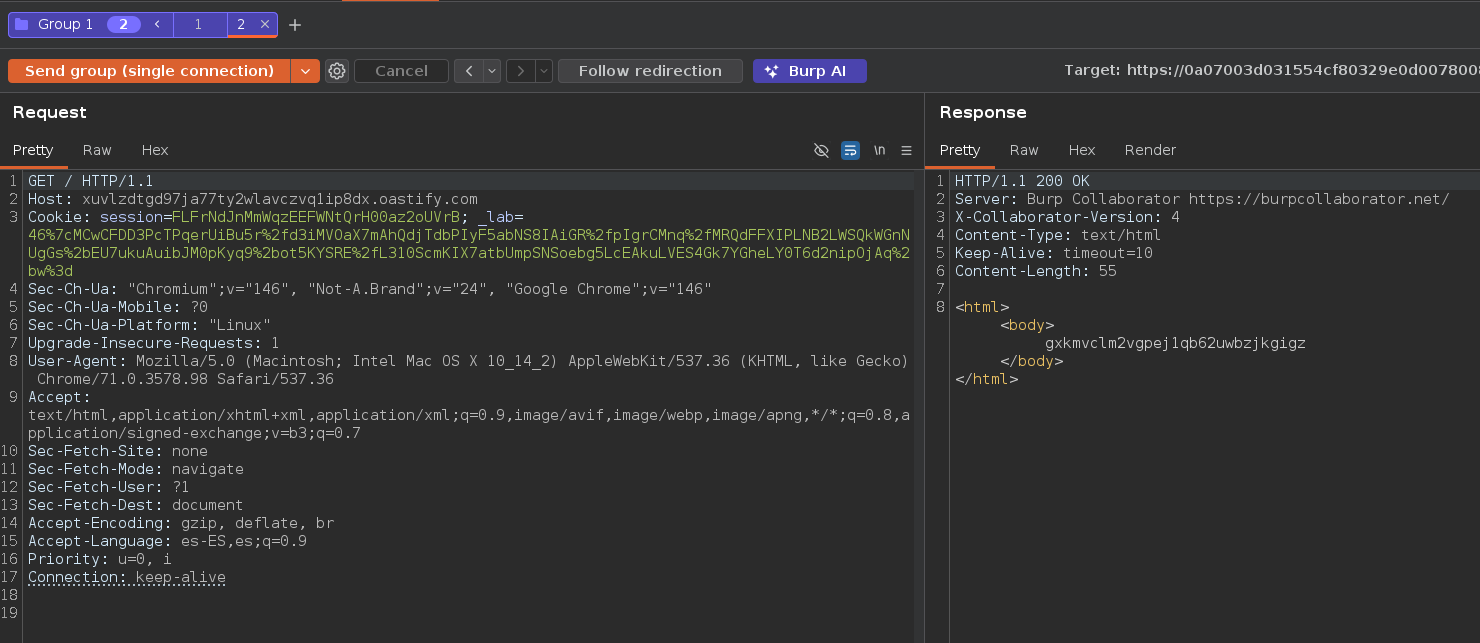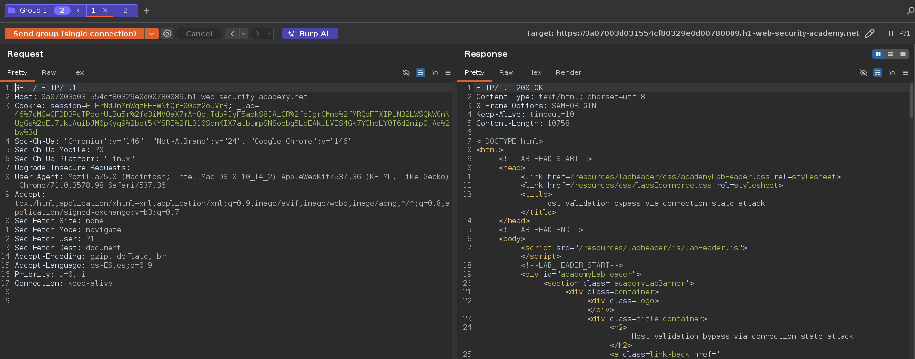 El error de la segunda petición se produce porque el dominio no existe. Para verificar que esta es la causa, he usado un dominio de Burpsuite Collaborator. Lo que al parecer ha pasado aquí es que el servidor analiza la cabecera Host, comprueba si su valor es un dominio confiable o whitelisteado y si no es así, hace un redirect al dominio principal. Sin embargo, el servidor asume que solo se va a enviar una petición por conexión, y por lo tanto, solo está verificando que el valor de la cabecera Host que emite la primera petición pertenece al dominio whitelisteado