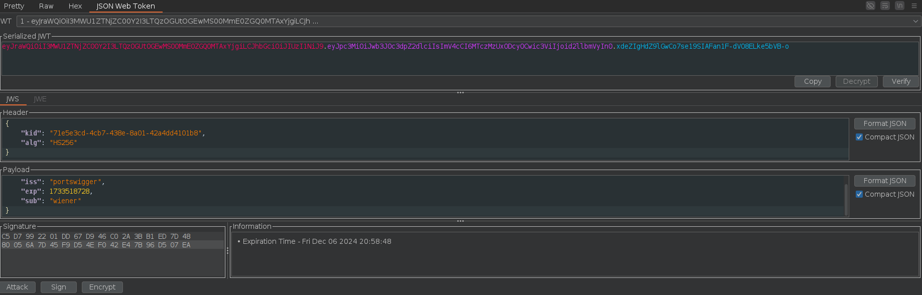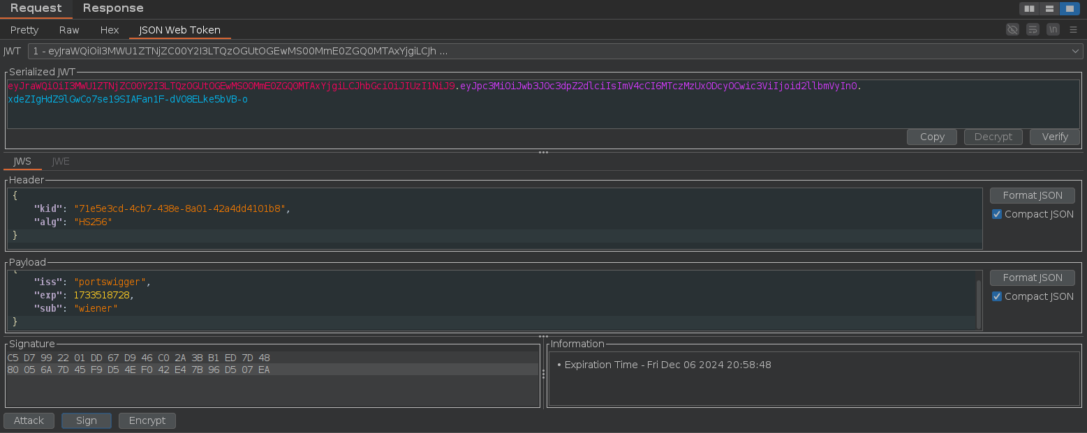 Este laboratorio utiliza un mecanismo basado en JWT para manejar las sesiones. Utiliza una clave secreta extremadamente débil para tanto firmar como verificar tokens. Esto puede ser fácilmente forzado utilizando un diccionario con secretos conocidos. Para resolver el laboratorio, primero debemos bruteforcear la clave secreta del sitio web. Una vez que la hayamos obtenido, la usaremos para firmar un token de sesión modificado que nos dé acceso al panel de administración en /admin y eliminar al usuario carlos. Podemos iniciar sesión en nuestra propia cuenta utilizando las credenciales wiener:peter