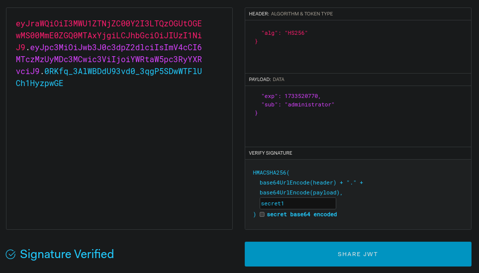 Otra opción hacerlo en jwt.io https://jwt.io/ , cambiamos nuestro nombre por el de administrator e introducimos el secreto. La opción secret base64 encoded es para encodear el secreto en base64, en este caso al no estar encodeado el secreto no debemos marcar la casilla