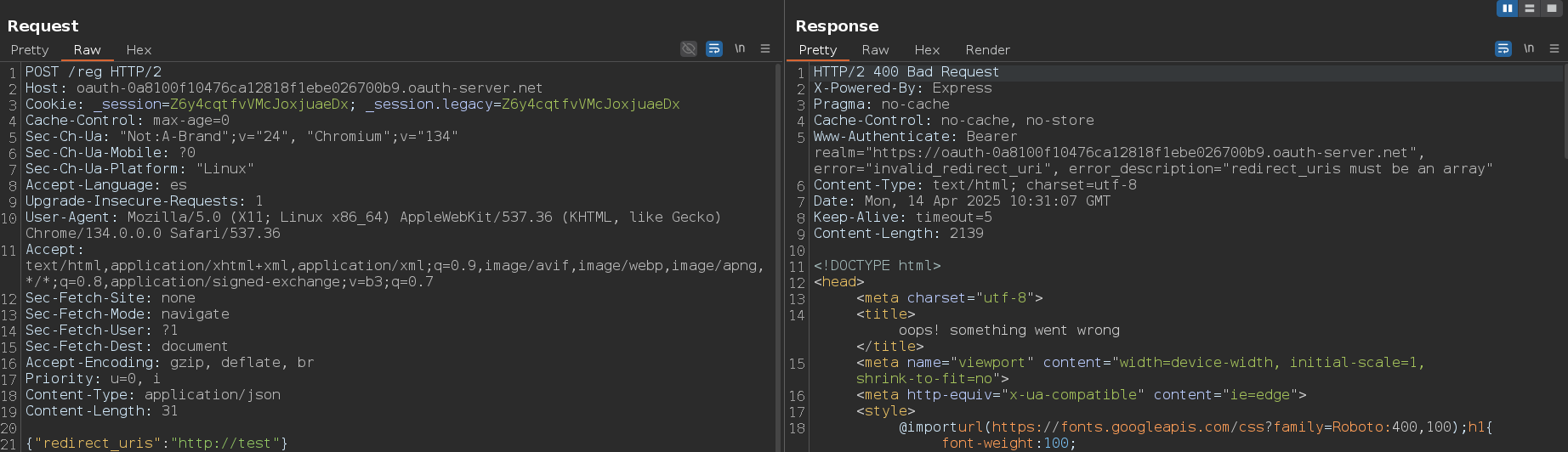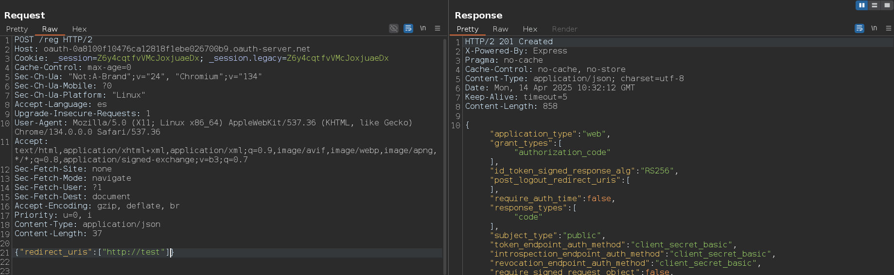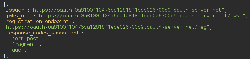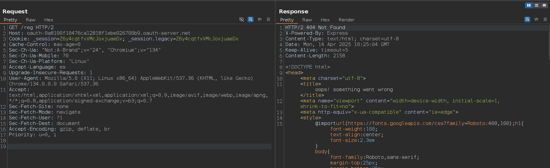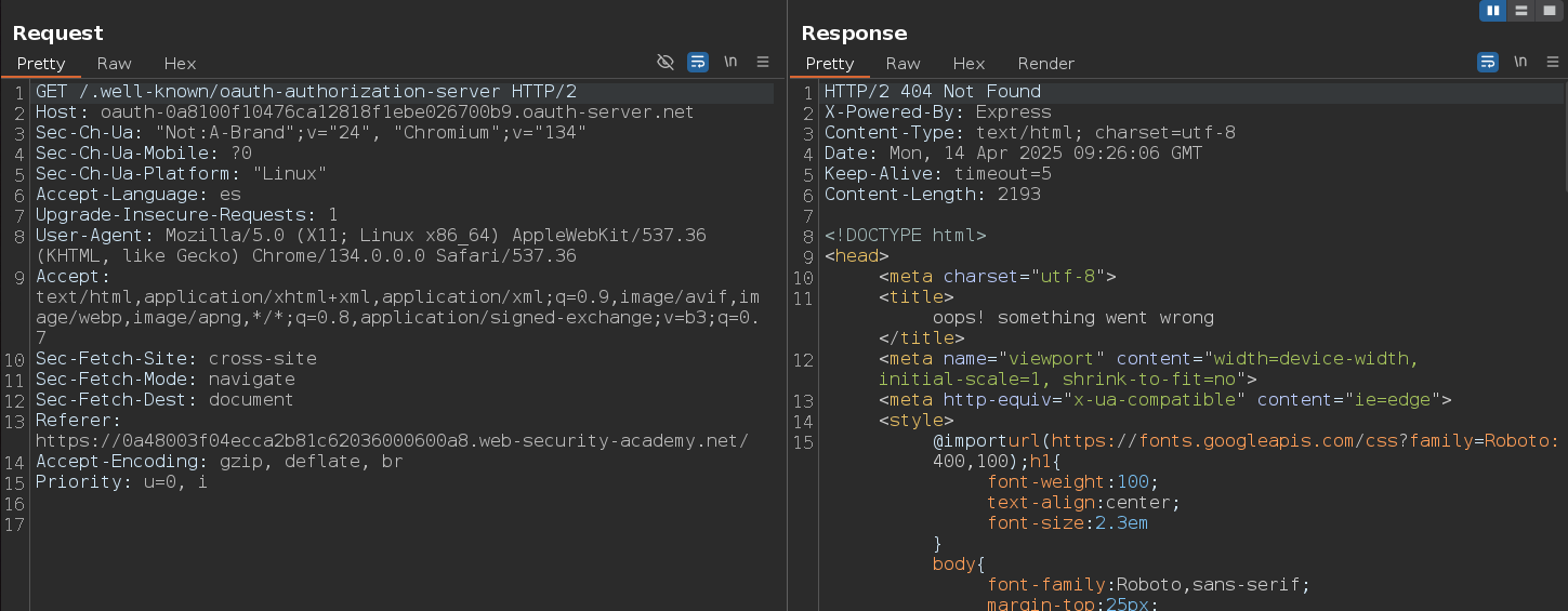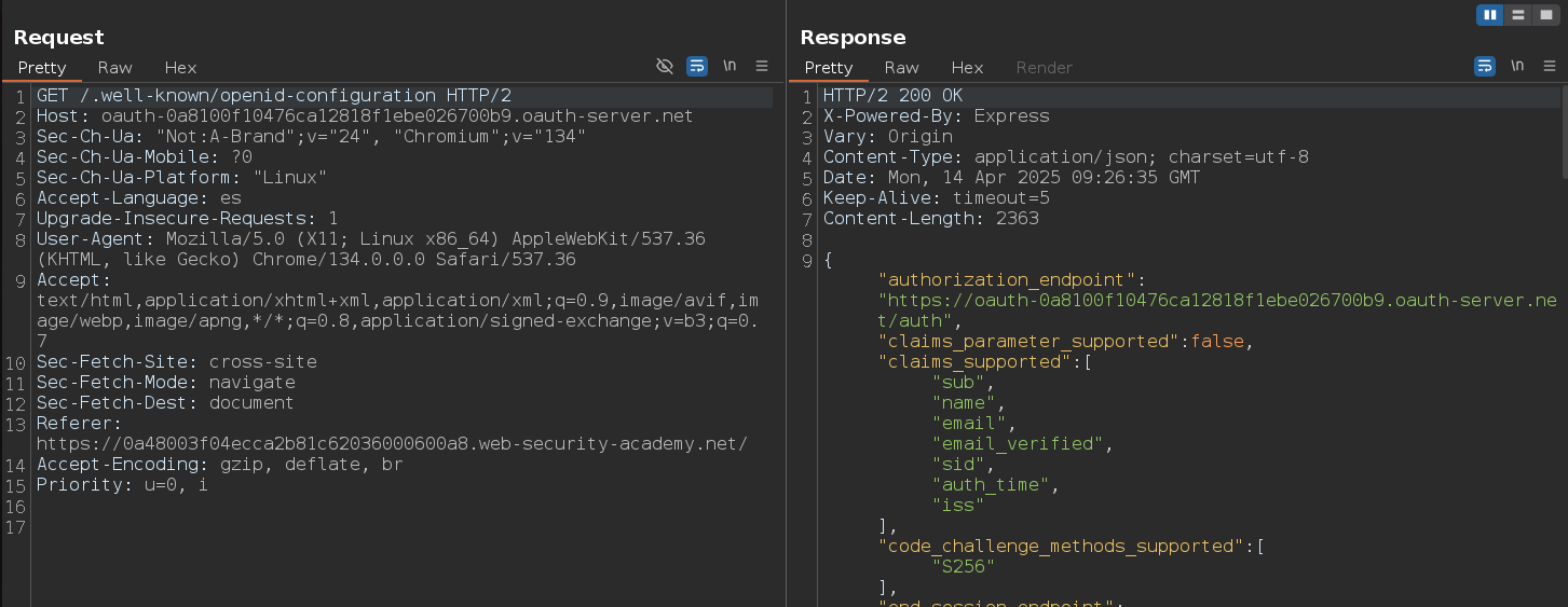 Si tenemos el nombre de host del servidor de autorización podemos enumerar estos endpoints para obtener información que puede resultarnos útil, es recomendable hacer esto porque puede revelar una superficie de ataque más amplia o características admitidas que no se mencionan en la documentación. En este caso es la única opción debido a que Portswigger no cuenta con una API pública y por lo tanto, tampoco cuenta con documentación de la que obtener información interesante