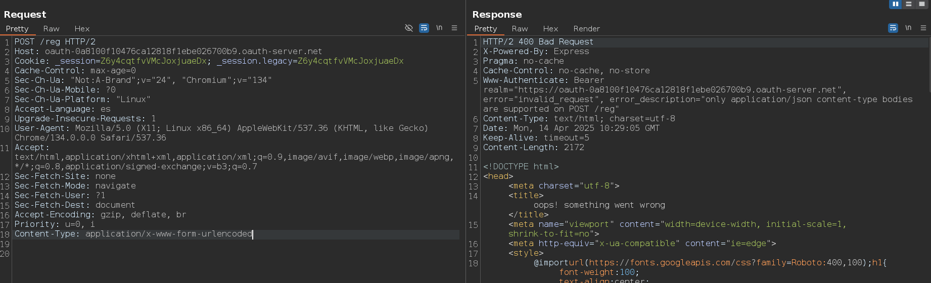 Si probamos a cambiar el Content-Type a x-www-form-urlencoded nos devuelve un error, el cual dice que para peticiones por POST a /reg solo admite Content-Type: application/json