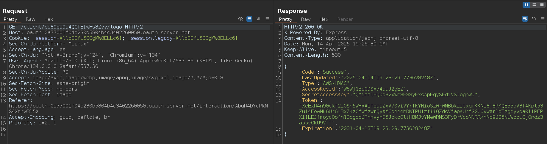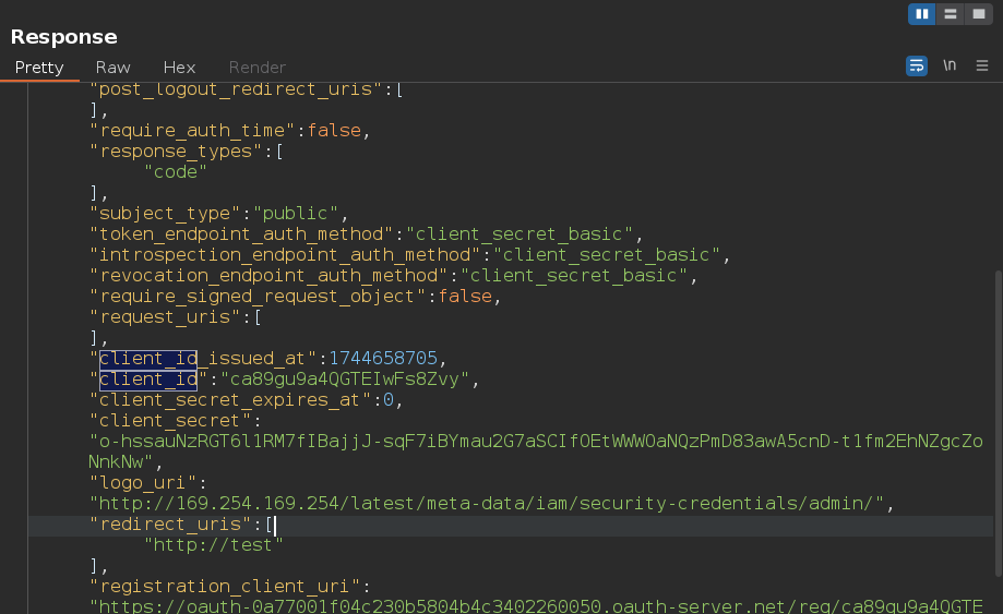 Nos copiamos el client_id y accedemos al logo de nuestra aplicación cliente que está apuntando al endpoint http://169.254.169.254/latest/meta-data/iam/security-credentials/admin/
