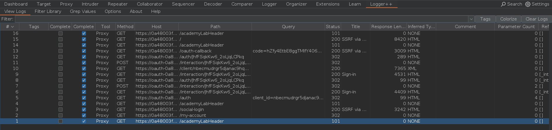 Si nos dirigimos a la extensión Logger ++ de Burpsuite vemos todo el flujo de peticiones