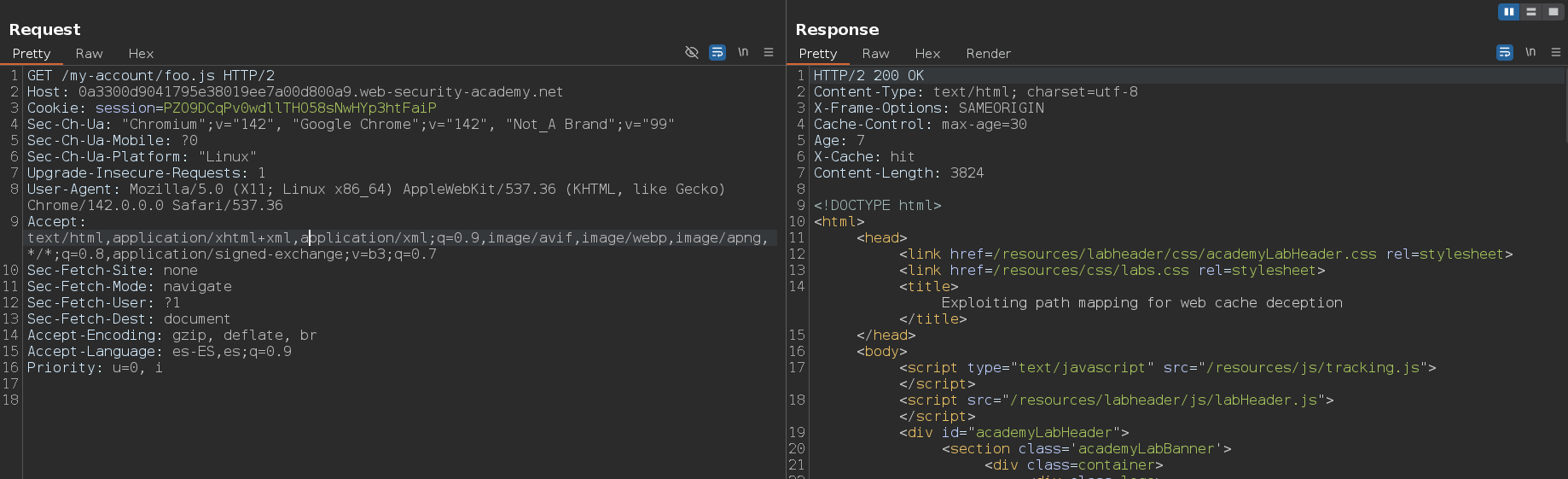 El siguiente paso es comprobar si la caché mapea la ruta de la URL a los recursos, es decir, tenemos que comprobar si la caché toma toda la ruta como válida, aunque incluya subrutas o extensiones que no existen realmente en el backend . Si añadimos alguna de las extensiones .js, .css o .svg, el recurso /my-account se almacena en la caché. Esto lo podemos saber gracias a las cabeceras X-Cache: miss, Cache-Control: max-age=30 y Age: 1
