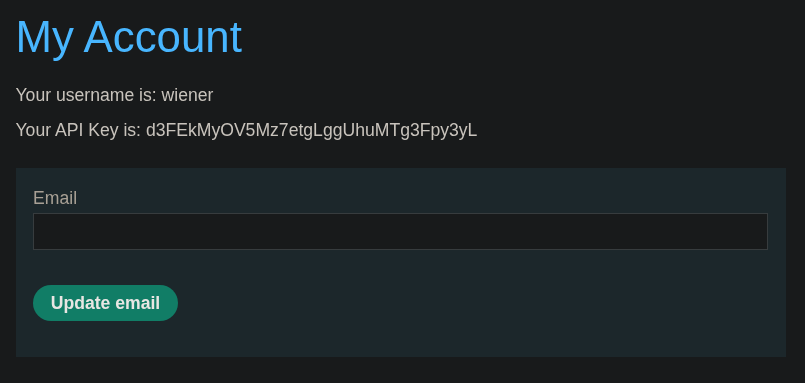 Para resolver el laboratorio, debemos encontrar la API key del usuario carlos. Podemos iniciar sesión en nuestra cuenta utilizando las credenciales wiener:peter