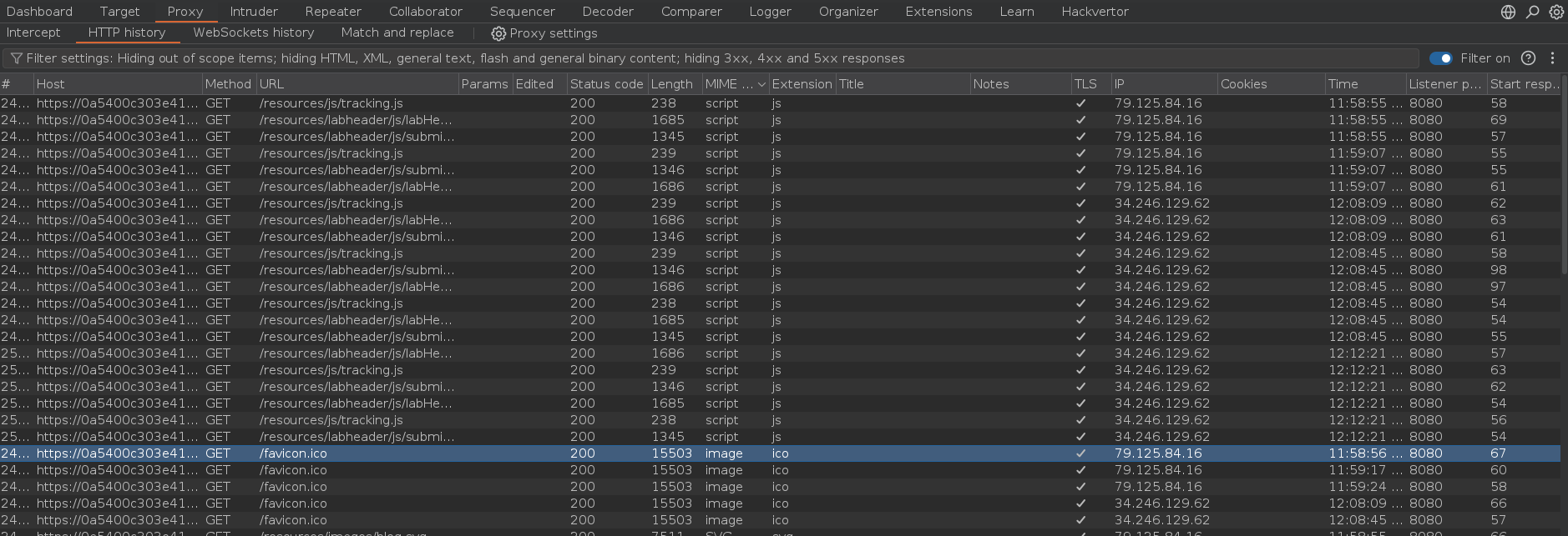 Como la petición nos resuelve a /my-account, esto significa que el servidor de origen decodifica la barra y resuelve el dot-segment. El siguiente paso es detectar la normalización por parte del servidor de caché, para ello debemos buscar solicitudes con prefijos comunes de directorios estáticos y respuestas cacheadas en el HTTP History de Burpsuite