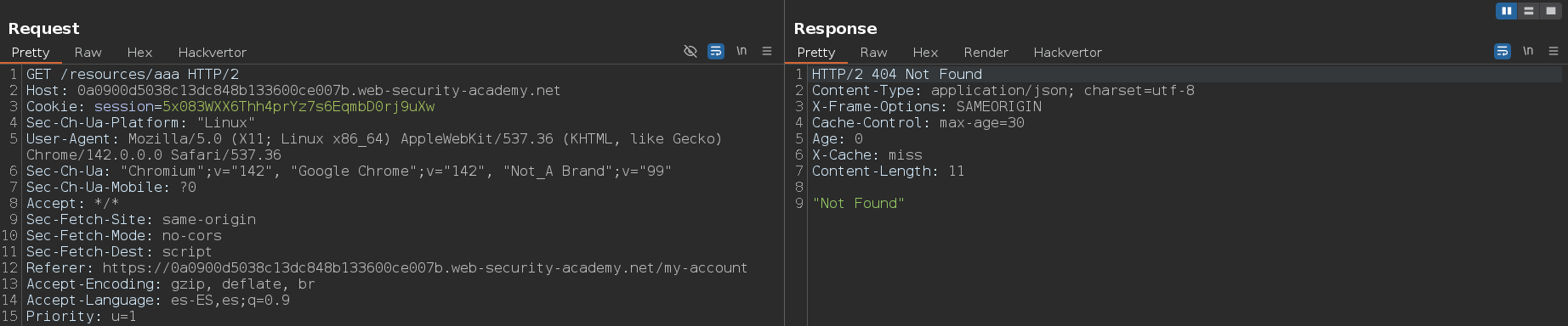 El siguiente paso es elegir una solicitud con una respuesta cacheada y reenviarla añadiendo una secuencia de path traversal y un directorio arbitrario al inicio de la ruta estática. Como vemos, ya no está actuando la caché, lo que significa que la caché no está normalizando la ruta antes de asignarla al endpoint. Esto demuestra que existe una regla de caché basada en el prefijo /resources/