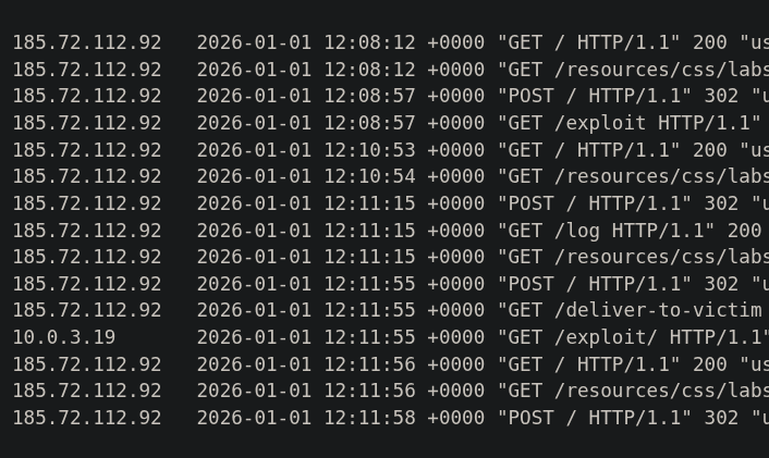 Ahora, vamos a conseguir la API KEY del usuario carlos, para ello, cambiamos el cachebuster=1 por cachebuster=2 para que se cree una nueva clave caché y pulsamos sobre Deliver exploit to victim. Si pulsamos sobre Access log, podemos ver que la víctima a accedido a nuestro enlace