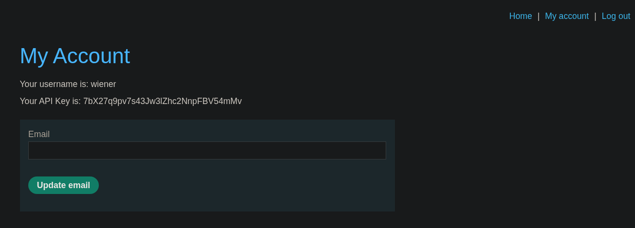 Para resolver el laboratorio, debemos encontrar la API key del usuario carlos. Podemos iniciar sesión en nuestra cuenta utilizando las credenciales wiener:peter