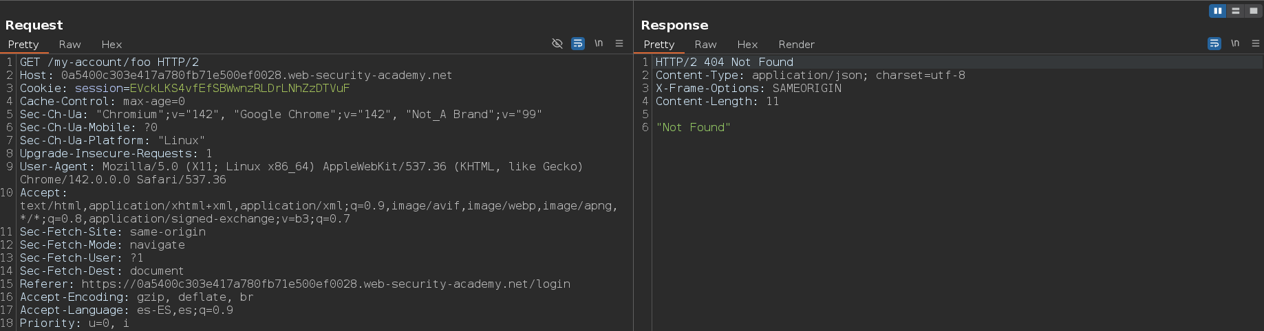 El siguiente paso es comprobar que delimitadores usa, para ello, el primer paso que debemos hacer es añadir una cadena aleatoria después de la ruta, por ejemplo /my-accountfoo y ver como responde el servidor. Esto lo hacemos porque si la respuesta es idéntica a la respuesta original, esto indica que la solicitud está siendo redirigida y deberemos de elegir un endpoint diferente para realizar las pruebas. En este caso nos devuelve un 404, por lo tanto, podemos continuar usando este endpoint para los testeos