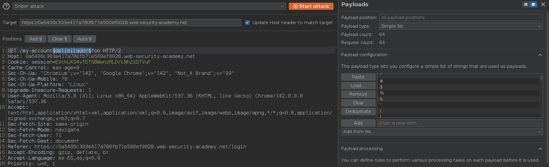 A continuación, añadimos un posible carácter delimitador entre la ruta original y la cadena arbitraria, por ejemplo /my-account;foo. En nuestro caso, vamos a enviar la petición al Intruder y a usar esta lista de caracteres que actúan como delimitadores https://portswigger.net/web-security/web-cache-deception/wcd-lab-delimiter-list