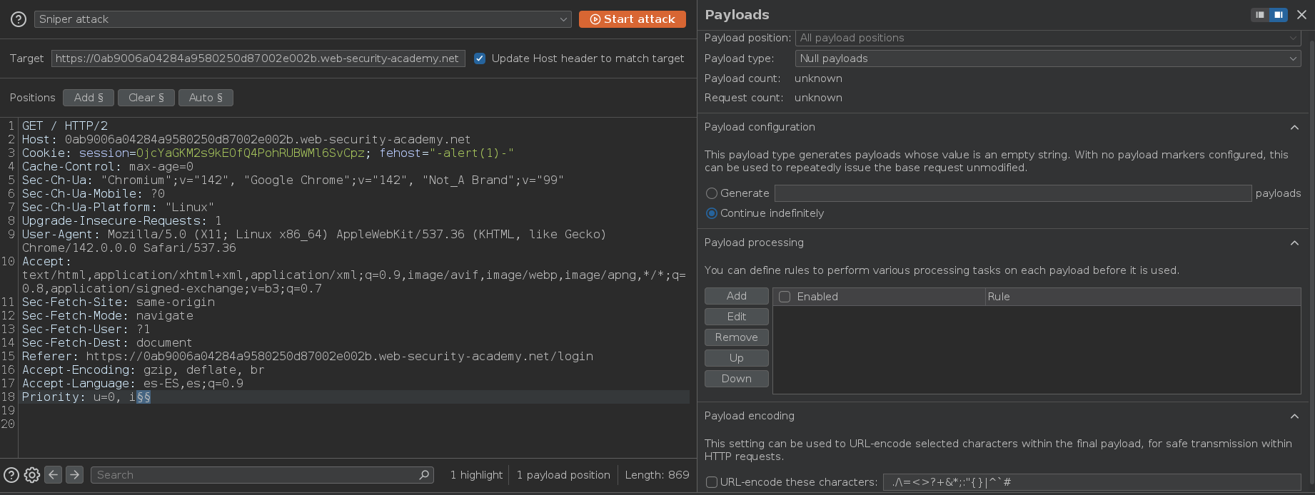 Si no queremos mandar la petición manualmente cada 30 segundos, podemos enviar la petición al Intruder, seleccionar Sniper como tipo de ataque, marcar un lugar aleatorio en el que inyectar los payloads, seleccionar null payloads como tipo de payload, en Payloads configuration marcar la opción Continue indefinitely y desactivar el URL encoding