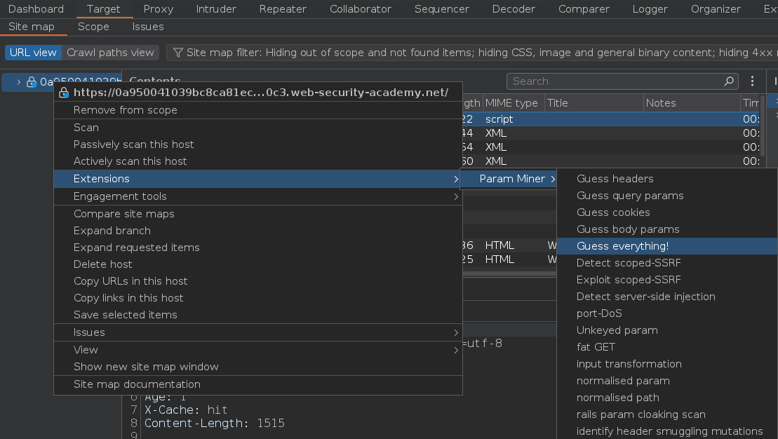 Una vez haya terminado el escaneo, vamos a usar la extensión Param miner para identificar entradas unkeyed. Debemos hacer click derecho sobre el dominio > Extensions > Param Miner > Guess everything!