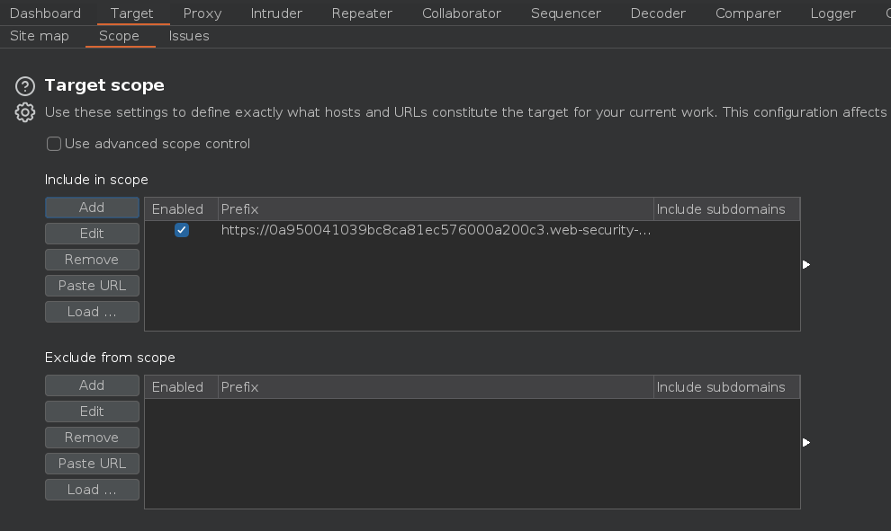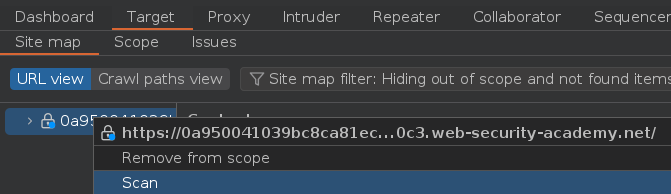 El segundo paso es identificar y evaluar entradas unkeyed, para ello vamos primero a crawlear la web con Burpsuite y a navegar manualmente por ella. Para hacer esto nos dirigimos a Target > Site map > Click derecho sobre el dominio > Scan