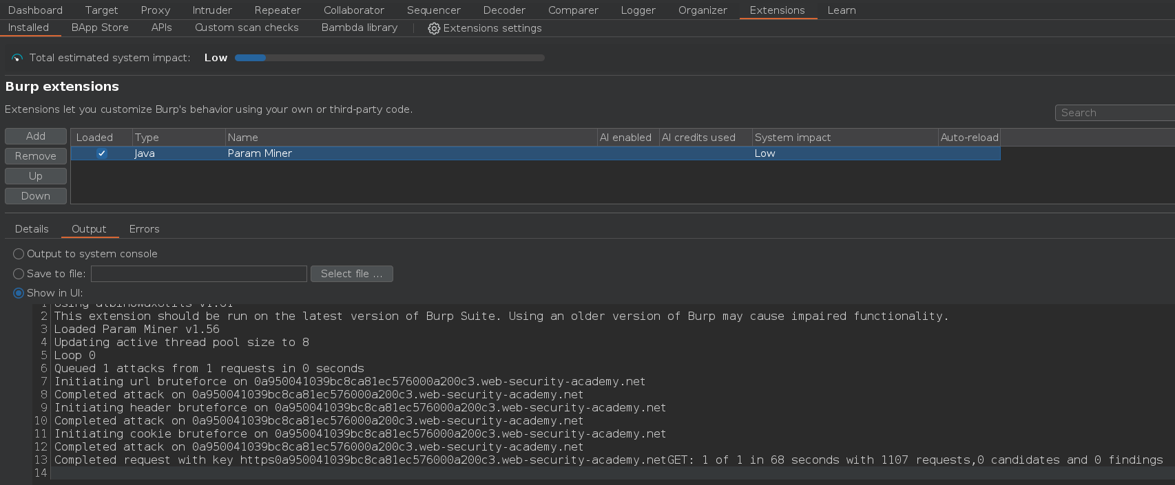 Si pulsamos en Extensions > Installed > Click izquierdo sobre la extensión > Ouput, podemos ver que Param Miner no ha encontrado ninguna entrada unkeyed