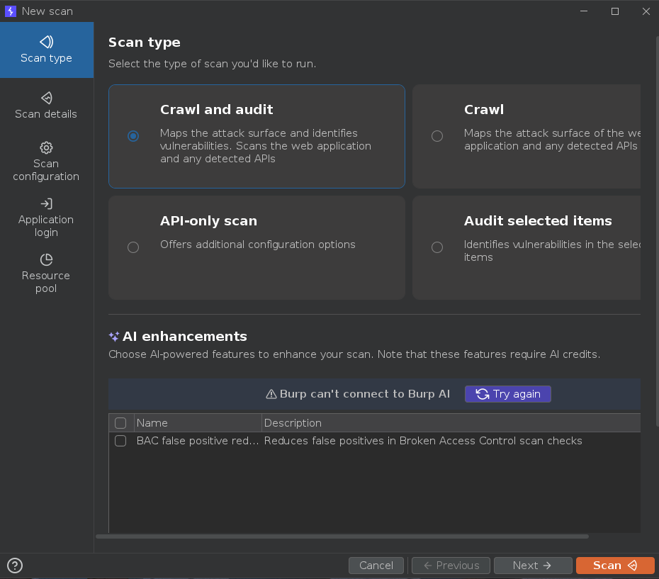 Seleccionamos la opción de Crawl y pulsamos sobre Scan. Mientras Burpsuite crawlea la web, vamos a navegar por ella de forma manual