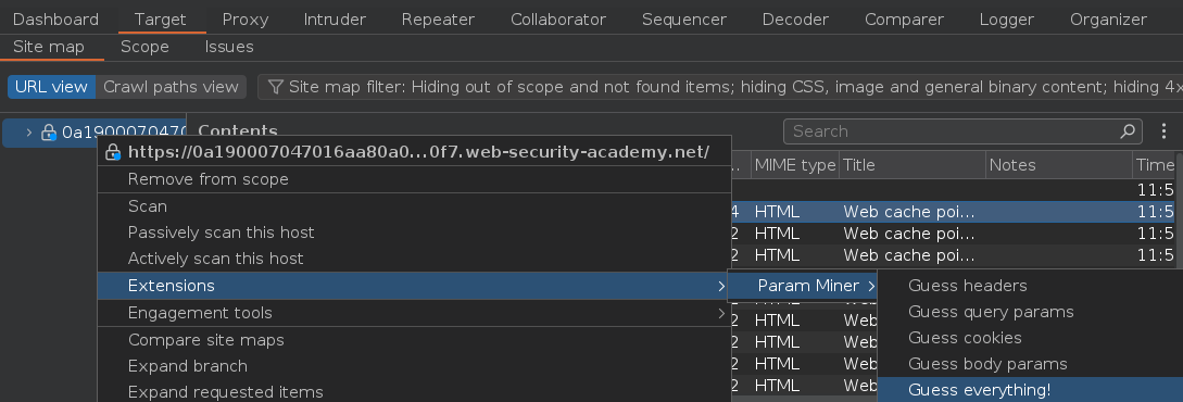 Una vez haya terminado el escaneo, vamos a usar la extensión Param miner para identificar entradas unkeyed. Debemos hacer click derecho sobre el dominio > Extensions > Param Miner > Guess everything!