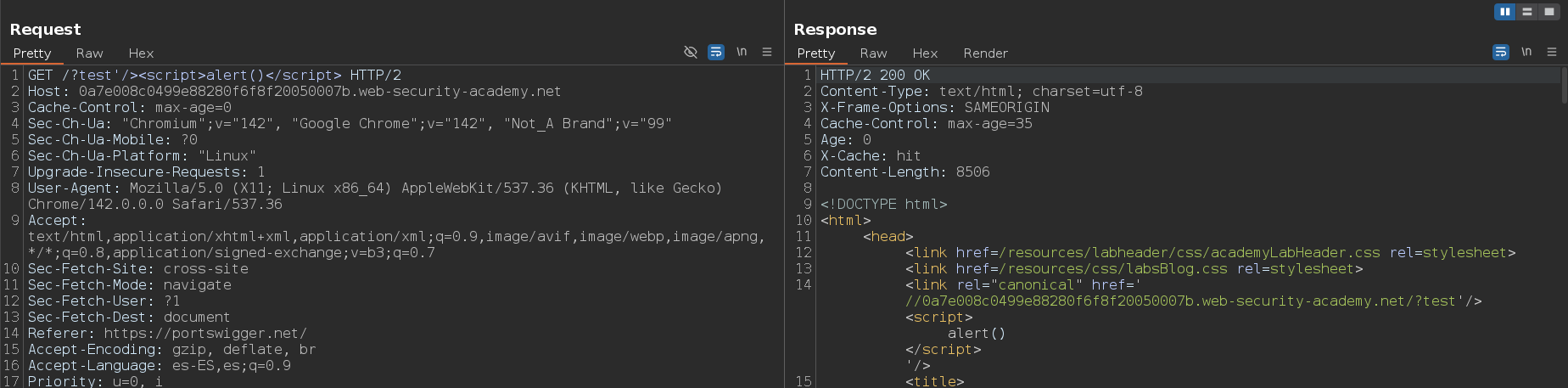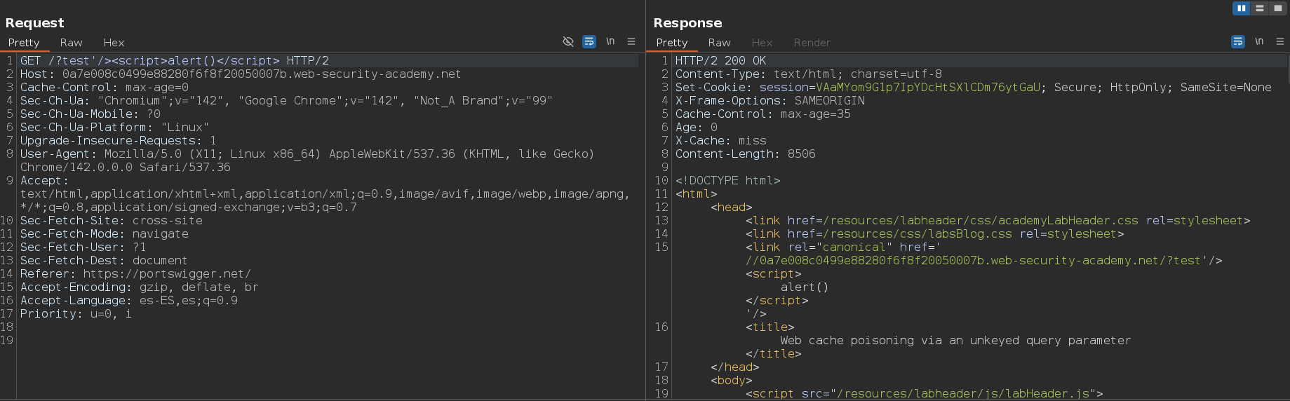 Esto se debe a que seguramente se utiliza toda la cadena de consulta para crear la clave de caché, por lo tanto, para que funcione el XSS el usuario víctima debe de acceder a /?test'/><script>alert()</script>. Cuando nosotros accedemos a esa ruta, vemos que el XSS ejecuta se correctamente